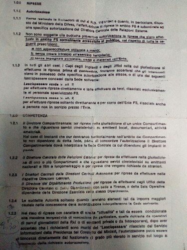 ferme restando le limitazioni al cui R.D. 1167/1941 e quanto, in particolare, disposto dal Ministero della Difesa, l'effettuazione di riprese in ambito FS è subordinata ad una specifica autorizzazione del Direttore Centrale delle Relazioni Esterne
