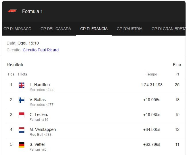 Puoi ben dirlo, io la F1 non la seguo più, come partono, così arrivano, non presenta ormai più il benché minimo spettacolo, nessun tipo di sorpasso, se non i doppiaggi.