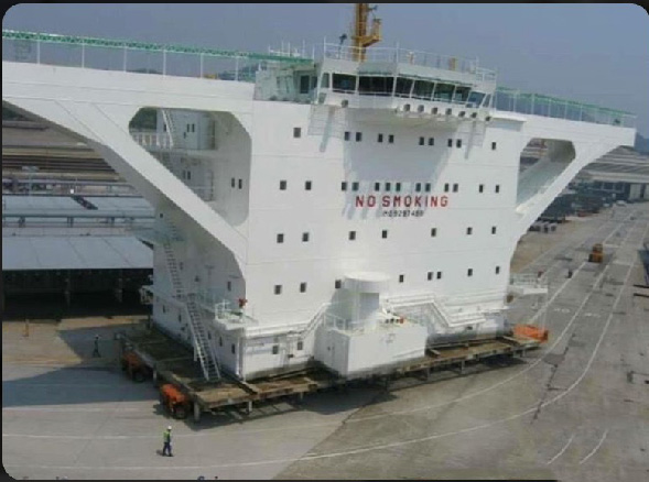 Intanto allego due foto che possano darvi l'idea dell'imponenza di questa nave e di una torre di comando che verrà poi sistemata sullo scafo, possiamo vedere a sinistra la sua imponenza a confronto con un operaio !! Ma ovviamente una foto della mia nave al vero, non può mancare ..sono immense !!