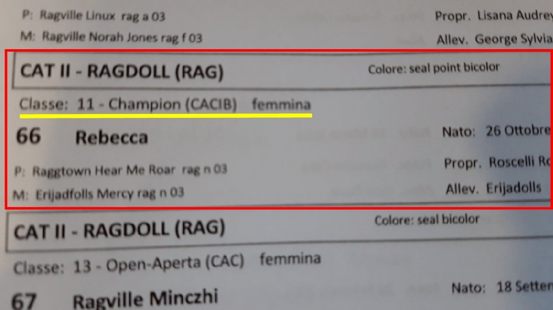 Ecco la lista dei gatti in Expo e Rebecca, con il numero 66, partecipapava come "Champion (CACIB)"