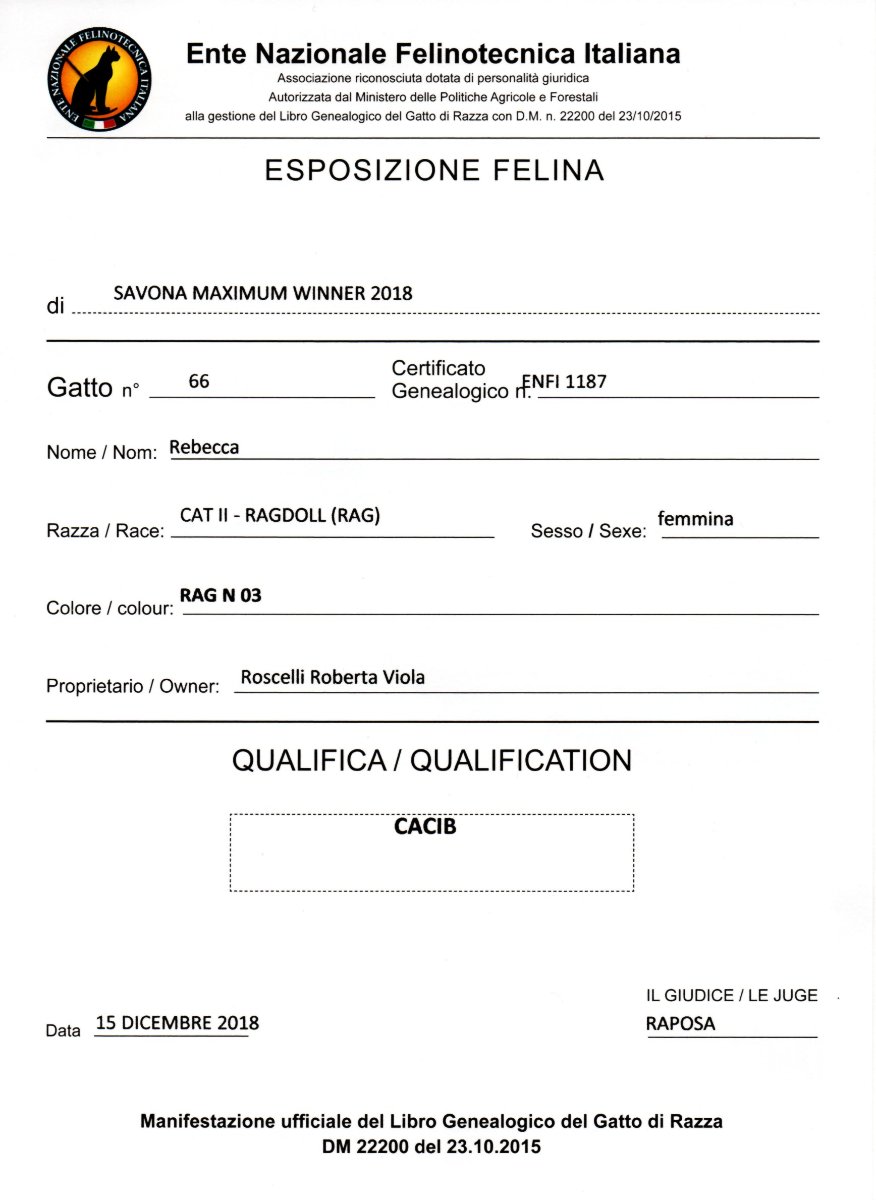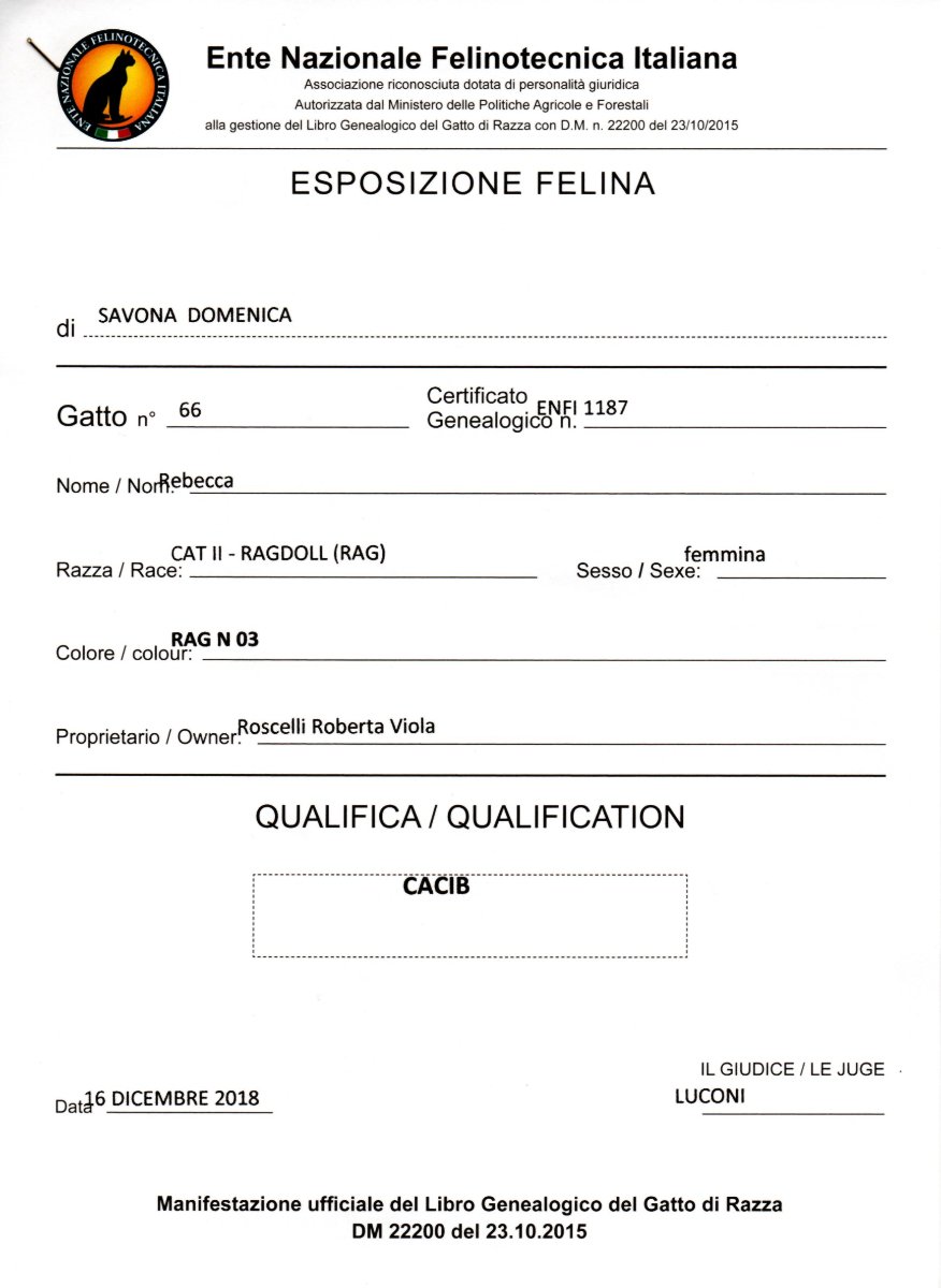 P.S. L'ho iscritta io. Quando mi hanno chiesto il nome del gatto ho detto semplicemente "Rebecca" e non "Herijadolls Rebecca of Violaragdolls"... Il suo nome sul Pedigree.