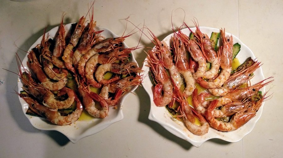 Si depositano le zucchine sul fondo, ci si mettono sopra i gamberoni e si cospargono con l'emulsione.