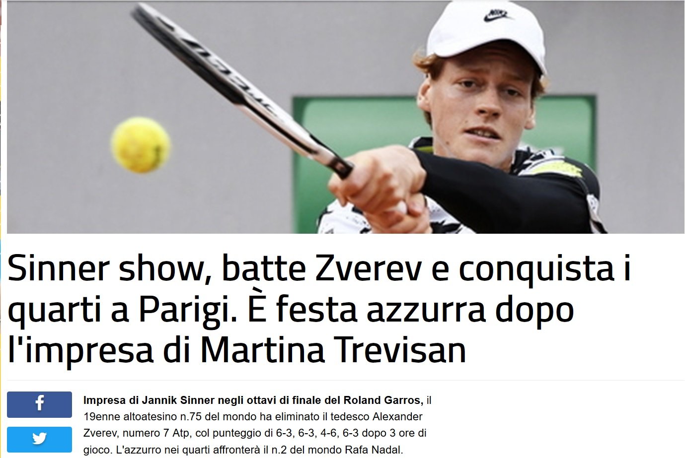 Roland Garros: Sonego e Sinner non si fermano, sono agli ottavi.