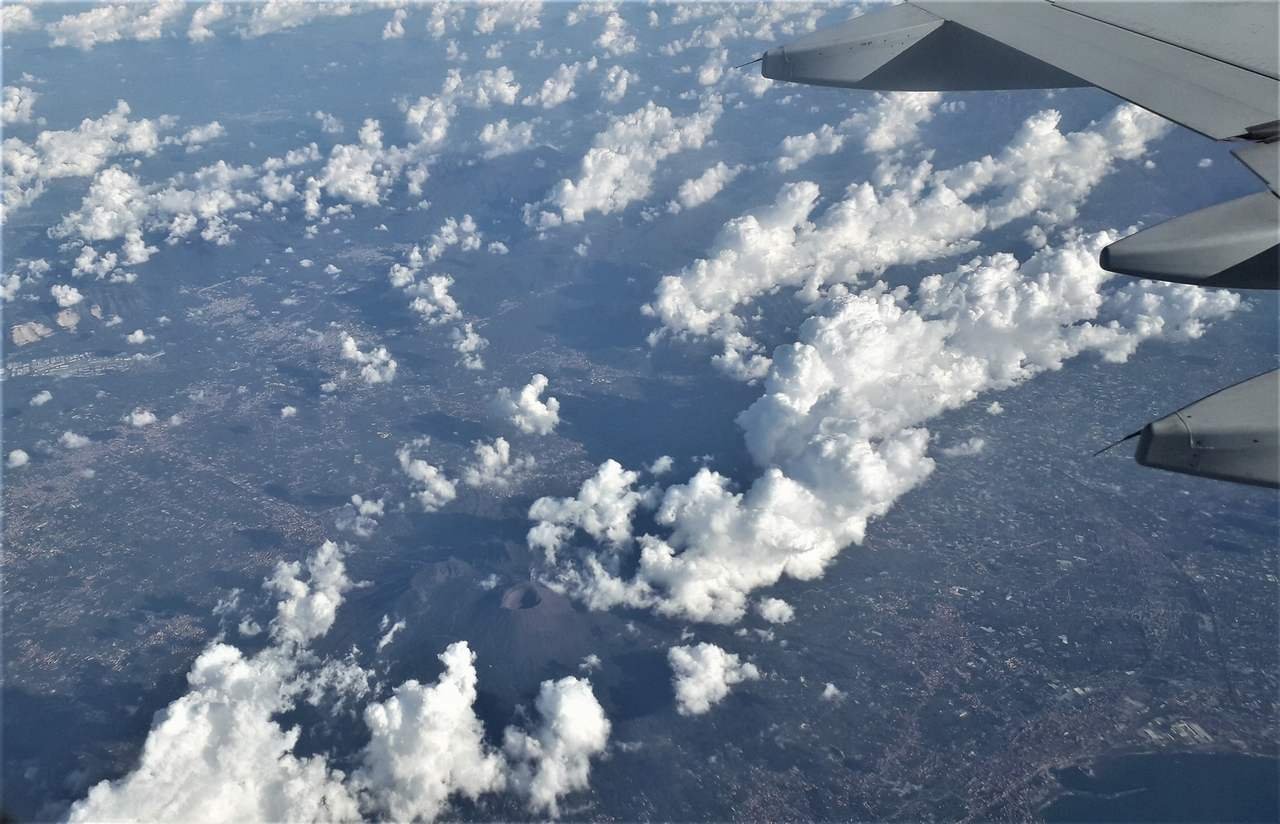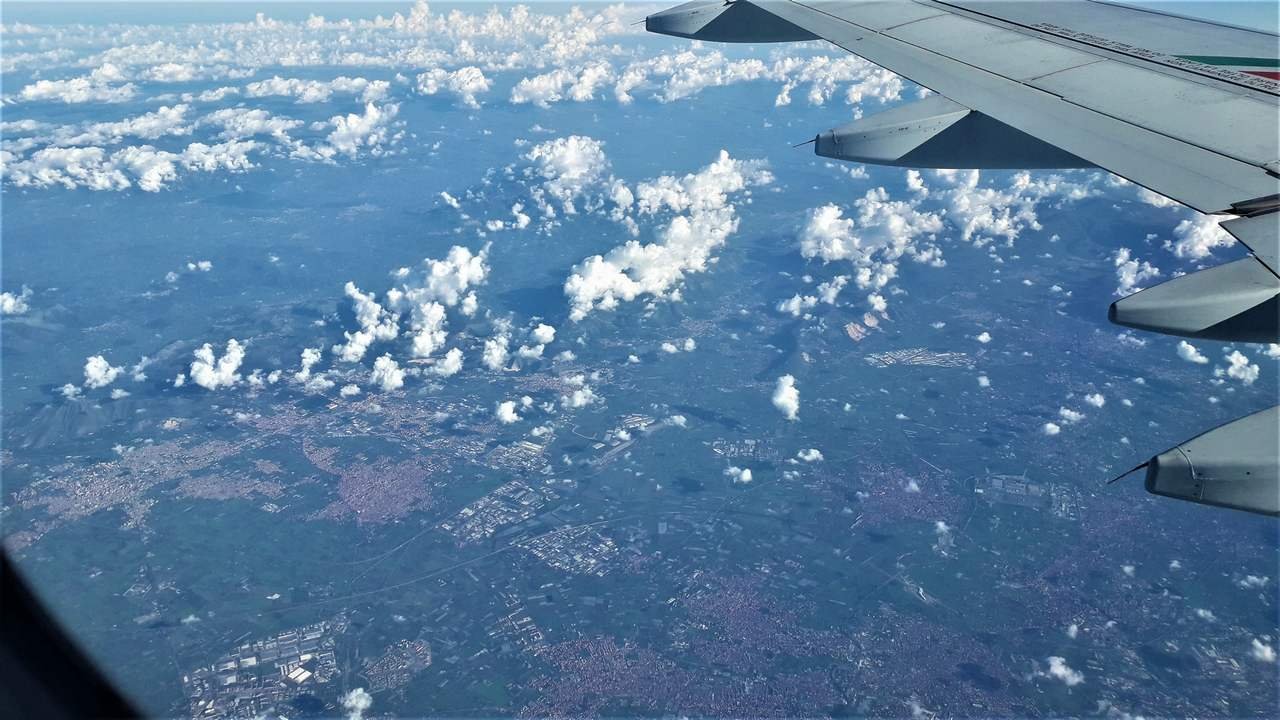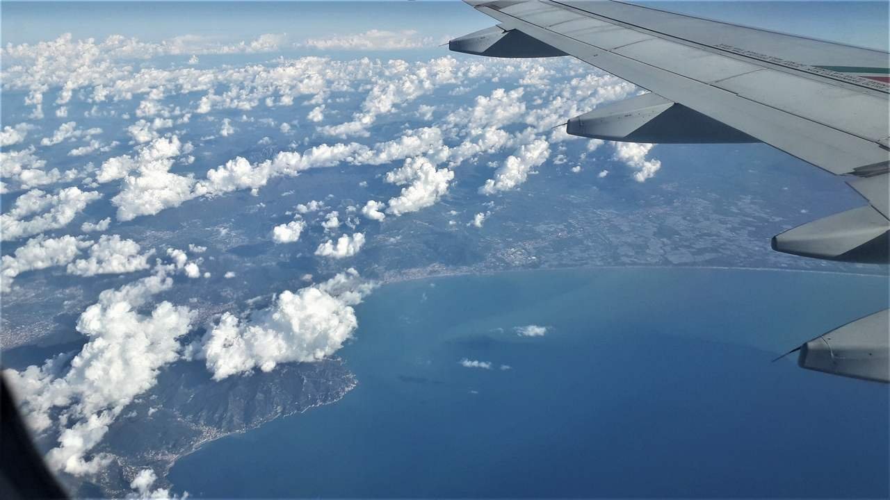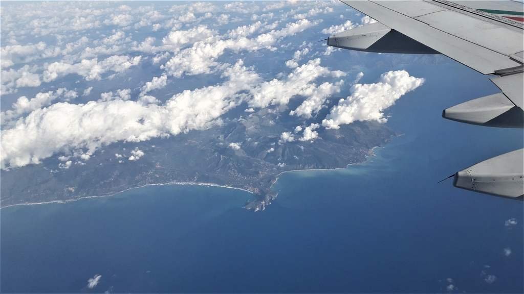 L'aereo decolla con qualche minuto di ritardo alle 10:55, quindi si porta subito al di sopra dello strato di nebbia, da quale si vedono apparire solo le cime più alte degli edifici di Milano e l'intera catena delle Alpi. Compiamo una virata di circa 180°, quindi ci dirigiamo verso sud e sorvoliamo la catena degli Appennini in prossimità del Passo della Raticosa, poi procediamo sorvolando la Valdichiana e giungiamo su Roma, che oltrepassiamo lasciandola alla nostra destra. Il viaggio procede sorvolando l'Agro Pontino, quindi giungiamo sopra il Mare Tirreno e vediamo alla nostra sinistra prima la Pianura Campana, poi Napoli, il Vesuvio ed infine Salerno con la Piana del Sele, per poi procedere con sempre in vista la costa tirrenica.