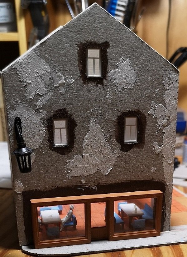Intanto posto un paio di foto su un bar che verra posizionato vicino alla stazione, per il cui nome mi sono dovuto spremere non poco le meningi... "bar alla stazione" eheheheh ispirato ad una foto che ho trovato in rete con un arredamento anni 60 circa.... forse ho esagerato coi dettagli , sottolineo battiscopa e tende... in quanto una volta chiuso... benche illuminato... forse certi dettagli si faranno fatica a vedere...