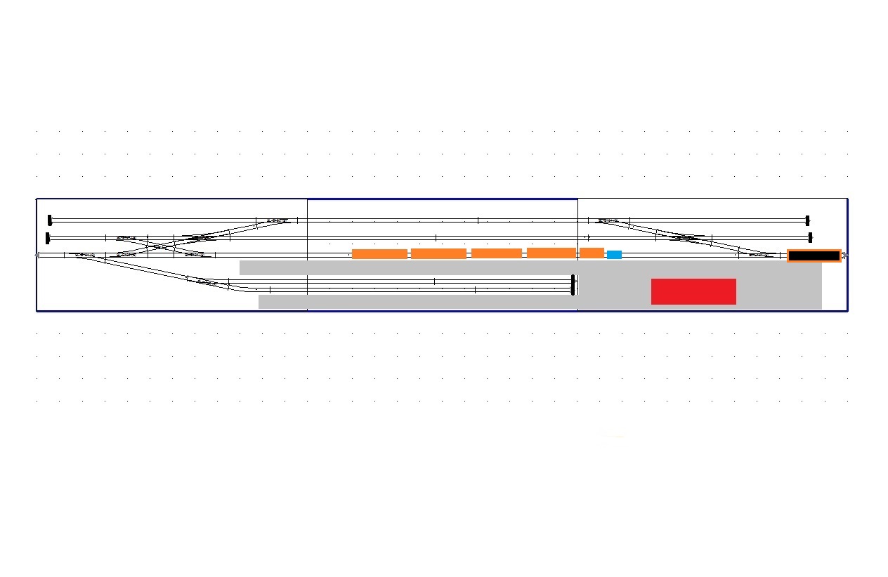 Nelle immagini che seguono, il solo binario 3 è organizzato per il giro loco, ma uguale funzione sarà presente anche sul binario 4. Il convoglio in arrivo sul binario 3, su comando dell'automatismo di Rocrail, si ferma a breve distanza dai deviatoi del lato deposito.