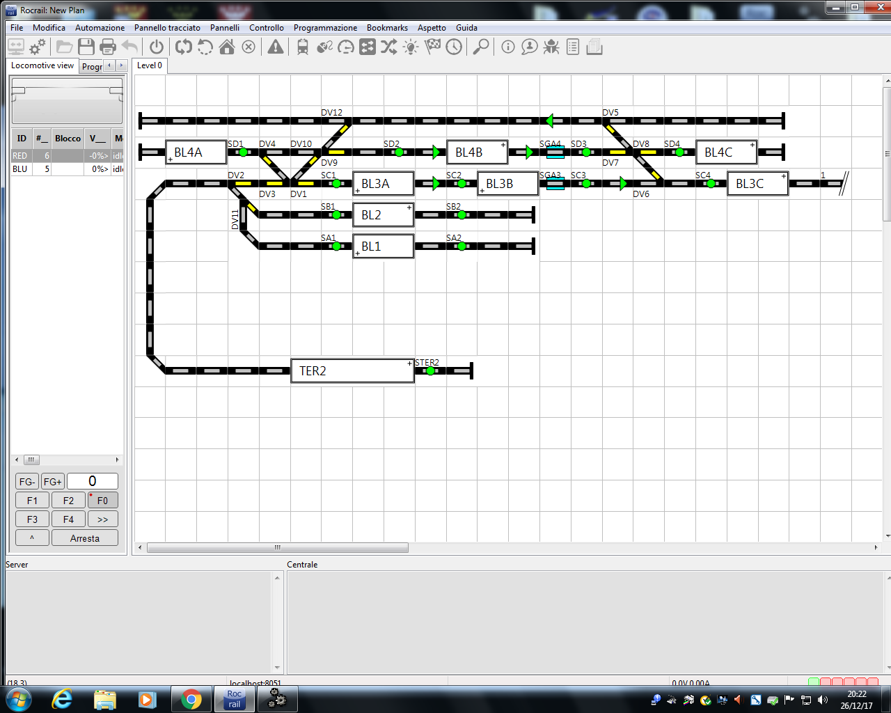 Ovviamente tutto il funzionamento automatico è stato prima ripetutamente provato e testato con Rocrail in versione virtuale per meglio comprendere come adattare il piano binari. Questo ha permesso di arrivare alla soluzione attualmente presentata che ha il vantaggio di effettuare il giro loco mentre continua l'esercizio automatico degli altri binari con le precedenza d'obbligo