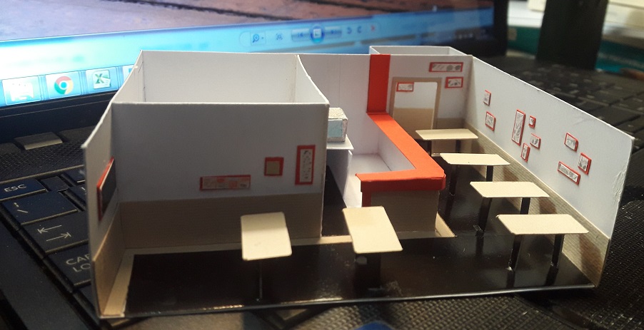 Ecco l'interno del Bar-Buffet. Mancano le sedie (che vorrei trovare fatte), qualche bottiglia sui ripiani e i vasetti di fiori sui tavoli. Idee su come realizzare queste minuzie? L'ambiente mi è rimasto un po' troppo stretto, ma degli interni non avevo preso le misure, sono andato a occhio.