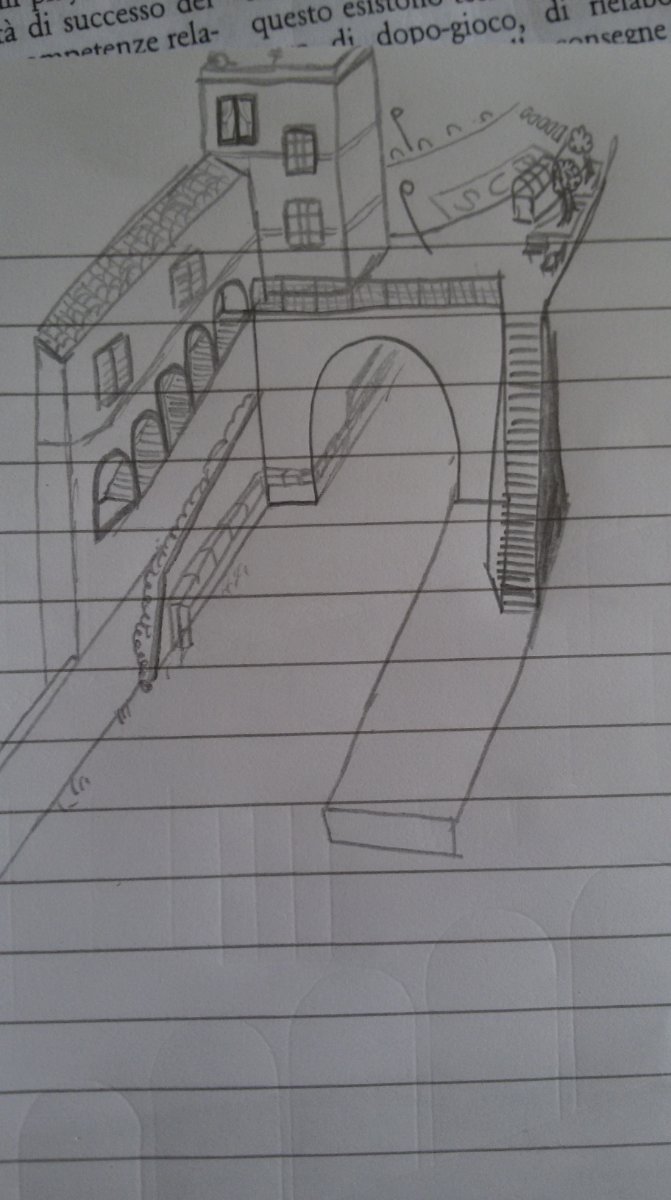 Per la pavimentazione opterò per dei sanpietrini, anche sugli scaloni. Il palazzo principale ospiterà un negozio, probabilmente un bar, anche se ancora non ne sono certo. A collegare i due palazzi ci sarà una costruzione ad arco, tipica del centro storico della mia città: Salerno