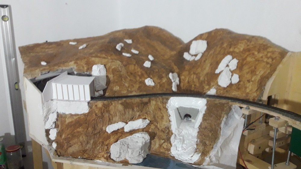 Poi ho realizzato già la struttura (centine in legno, listelli e rete metallica) del terreno nel modulo della Val dal Bugliet, costruita una versione provvisoria del portale della galleria e relativo riparo antineve (per verificare gli ingombri). Ho anche già sistemato il fondo (per ora solo con il colore base) per il lembo di Lago Bianco che sarà riprodotto (per ora provo il metodo del plexiglass descritto da Andrea in una sua fotoguida.