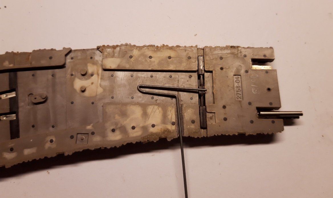 A questo punto si sagoma il filo armonico in modo che abbia una forma tale da rimanere in posizione piatta rispetto alle superfici del deviatoio e abbia anche un minimo di gioco nel suo movimento. Il risultato di qualche prova è quello che vedete nella foto seguente