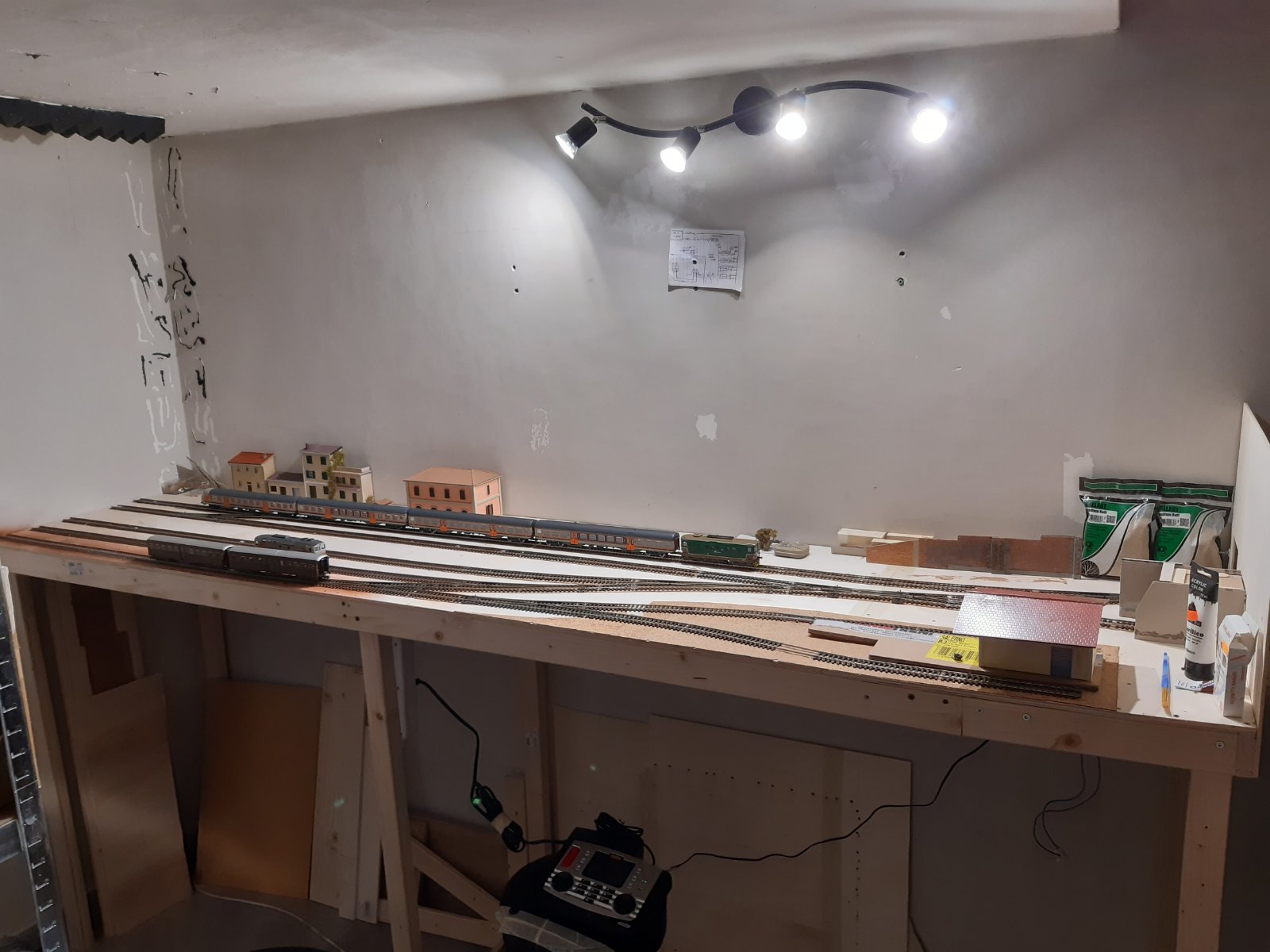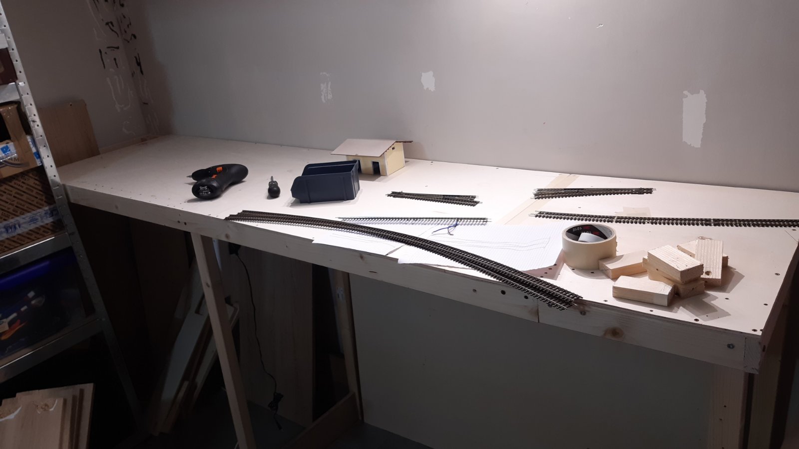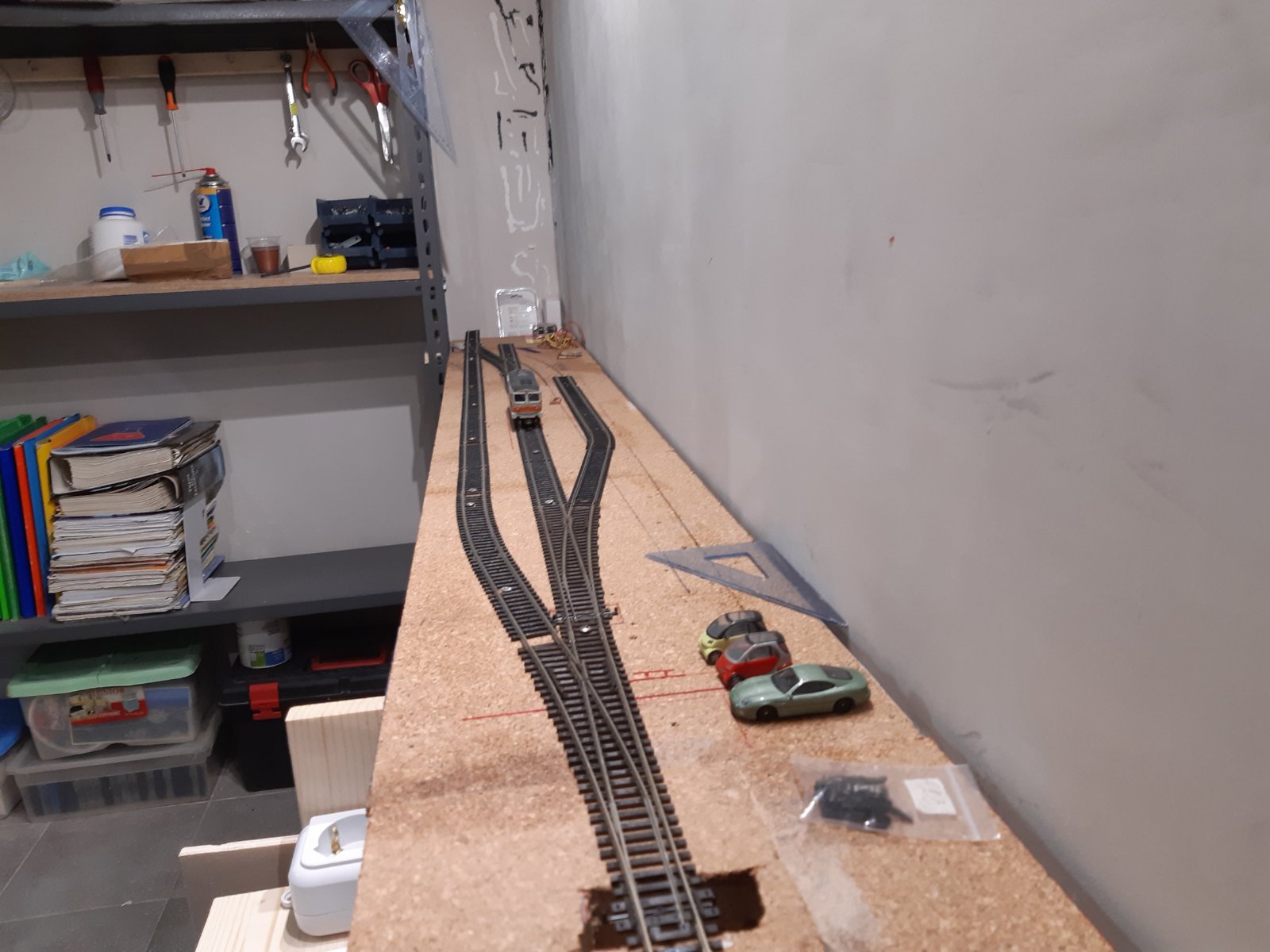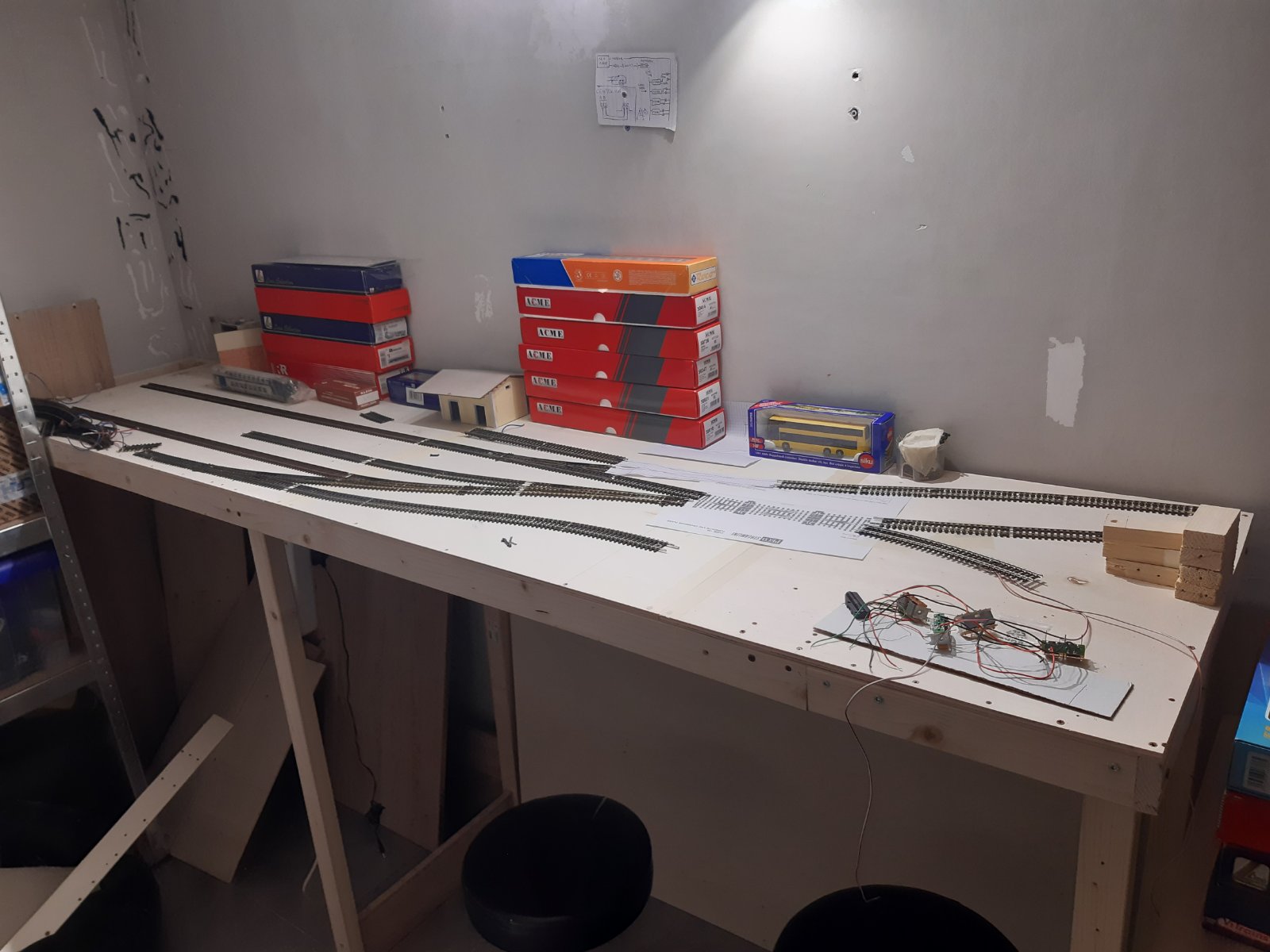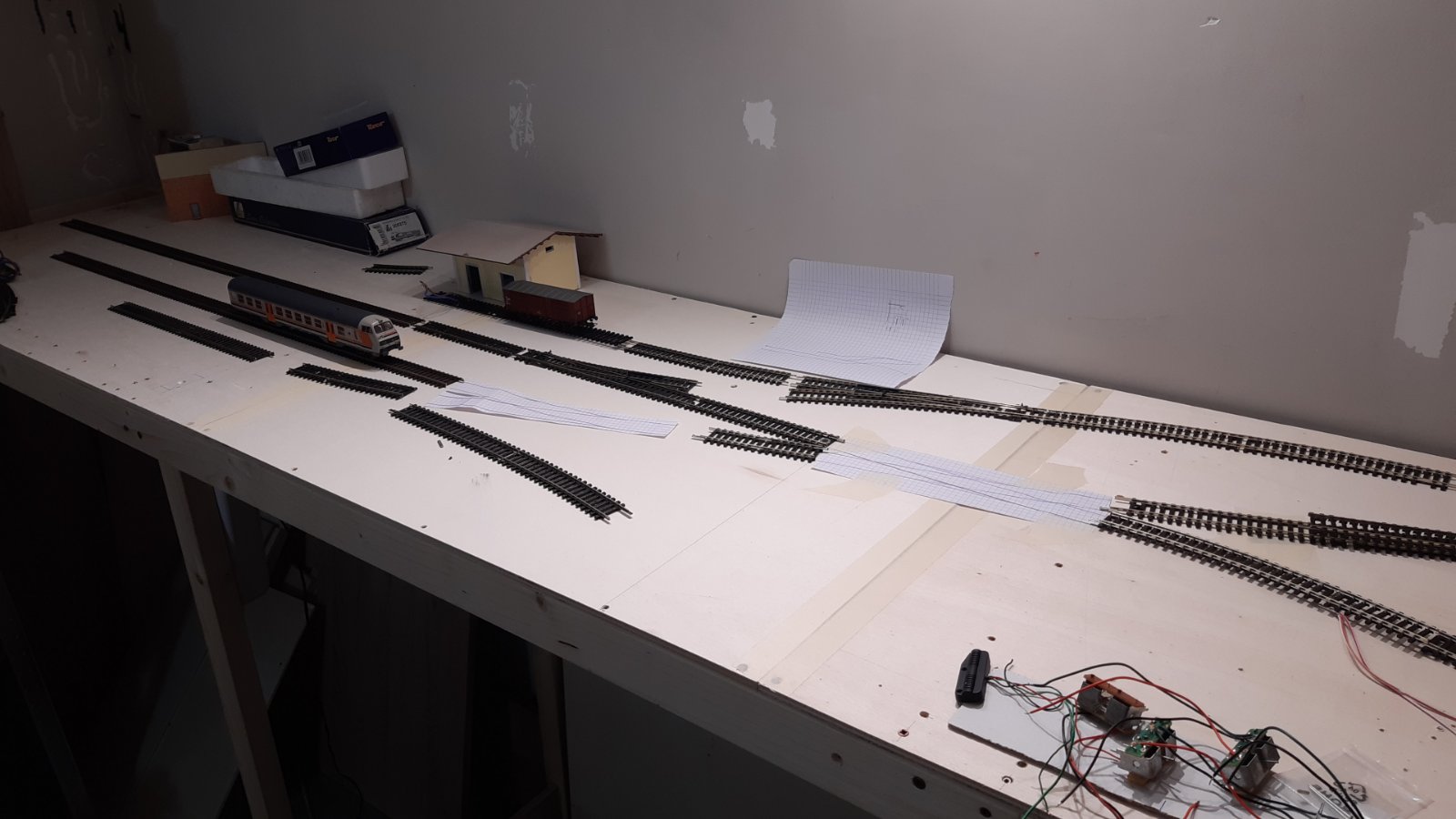Una volta terminata la costruzione della struttura, inizio a progettare il tracciato. Volevo riprodurre una piccola stazione di testa con un modesto traffico passeggeri (treni regionali soprattutto) e movimentazione merci. Insomma, qualcosa che mi desse soddisfazione e non diventasse noioso alla lunga.