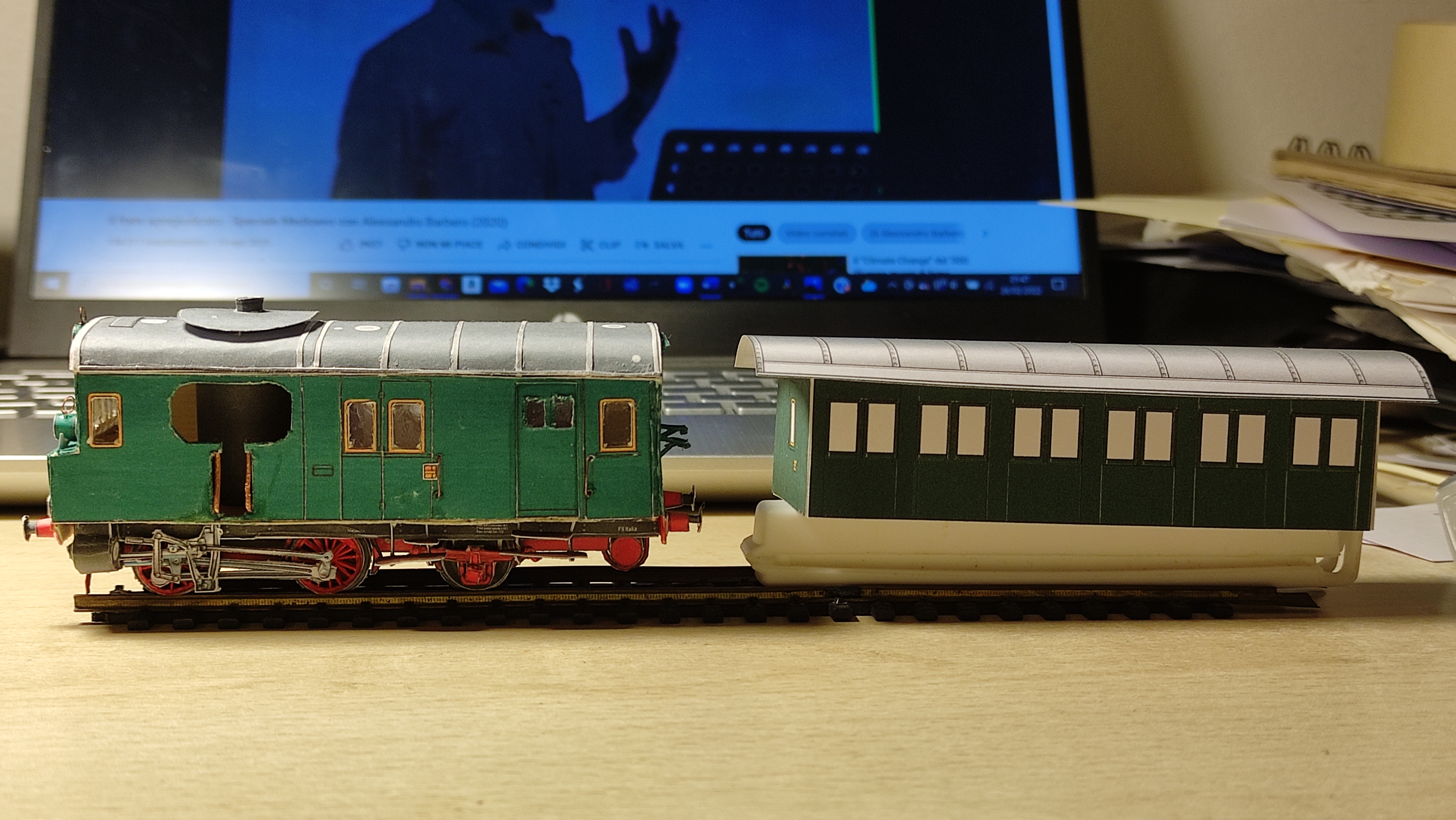 Ebbene sì, ho sospeso per ora il montaggio degli ultimi dettagli sulla loco e ho fatto la stampata di una prima versione della carrozza. Ecco come ho pensato di procedere: riciclo telaio (da modificare un po'), ruote, tetto e accessori da un modello di vagone bagagliaio, sempre di ZioPrudenzio.