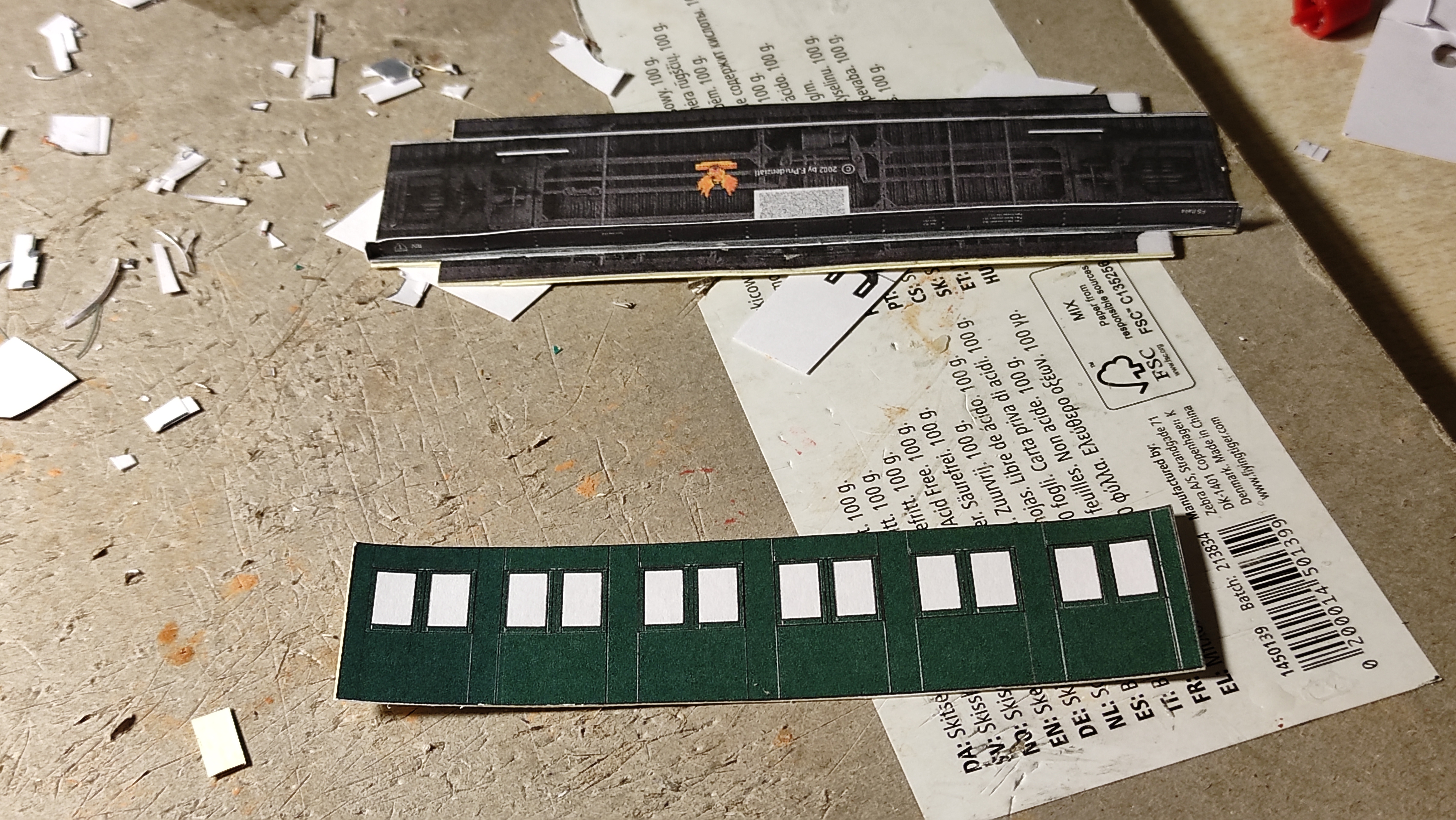 Ho iniziato a ritagliare la finestratura e ho fatto un velocissimo assemblaggio provvisorio con scotch carta (vedete le pareti ed il tetto tutti storti proprio perché solo tenuti in posizione; aggiungerò anche paratie di rinforzo).