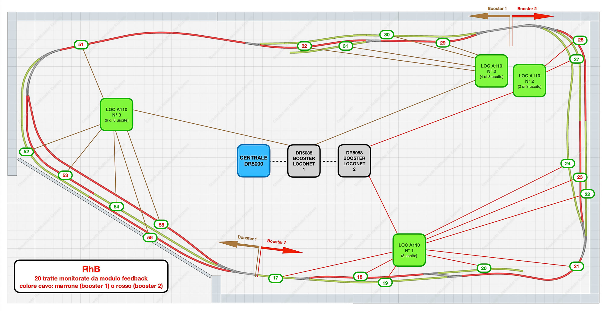 Quanto al segnale DCC ho deciso che la centrale (già acquistata) sarà collegata ai soli deviatoi e segnali mentre i binari saranno alimentati da due booster da 3A (sempre Digikeijs e di nuovo già acquistati).