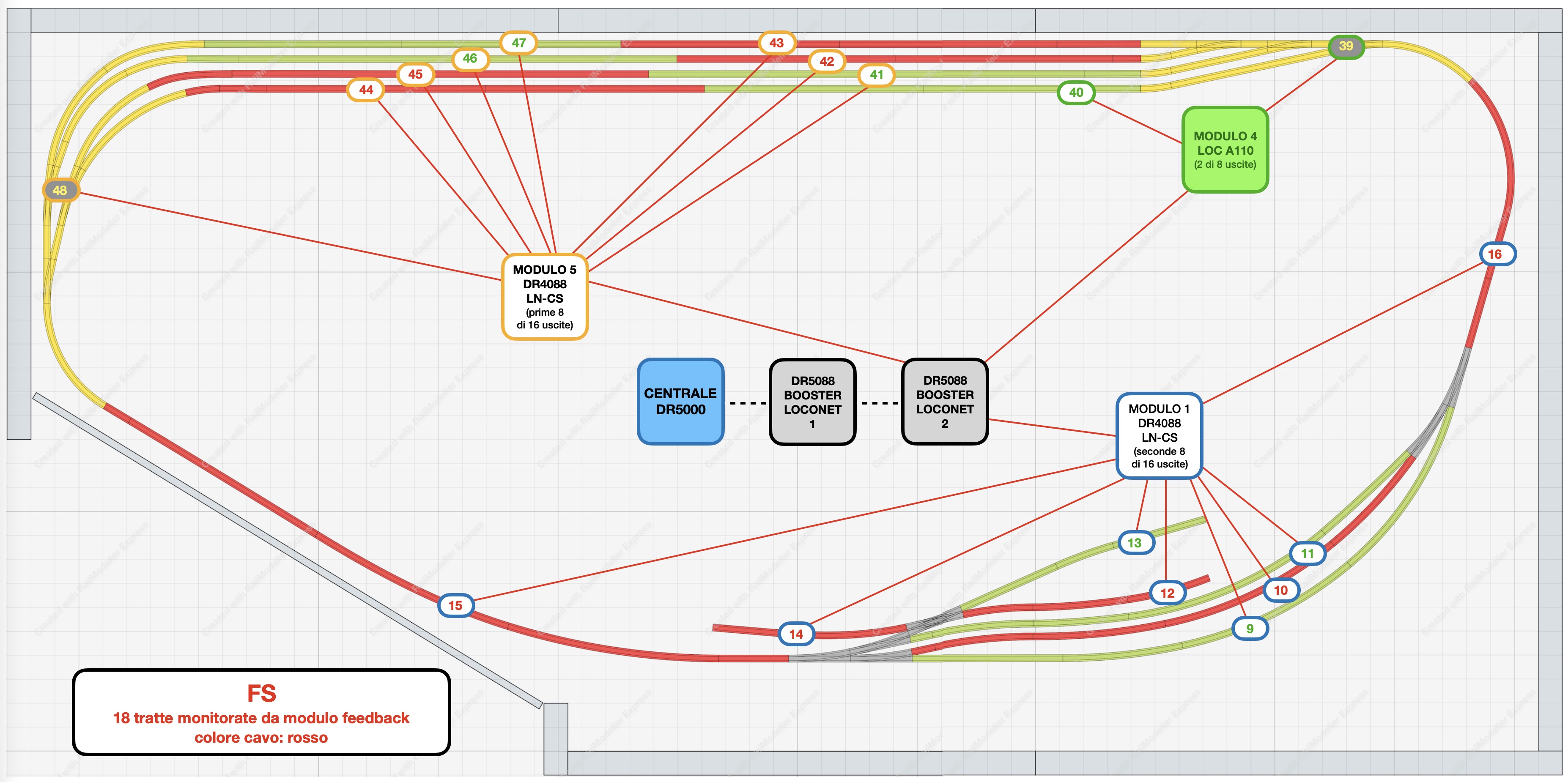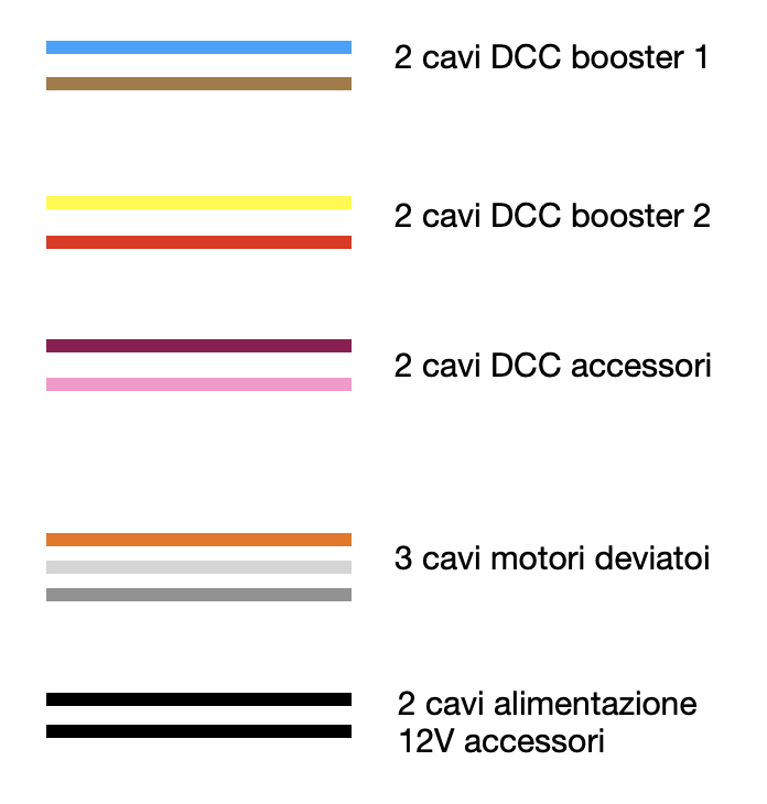 Proprio per semplificare il cablaggio, ti consiglio invece di usare moduli di retroazione a più tratte possibile, ce ne sono da 8 ma anche da 16 (li fanno multipli proprio per questo). Infatti una sezione di tracciato comporta un solo conduttore, peraltro anche di sezione non generosa visto con in una sezione ci starà certamente un solo convoglio e quindi non più di 3-400mA nel peggiore dei casi (parlo di assorbimenti misurati, il famoso caso delle ruote bloccate è talmente raro...). Quindi per ogni sezione hai un solo filo invece che il bus di comunicazione dei moduli di retroazione che in genere è un cavo RJ45 o RJ12 a seconda della soluzione che userai. Inoltre portare tutte le sezioni ad una morsettiera facilmente accessibile ti potrà essere molto di aiuto in caso di ricerca guasti e cortocircuiti.
