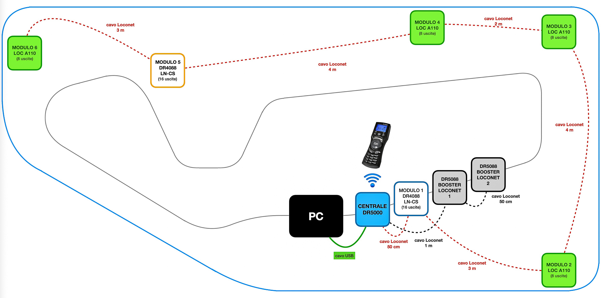 Per i moduli di retroazione userei il BUS Loconet e c’è un mix di moduli Digikeijs a 16 uscite e Oscilloscopio a 8 uscite.