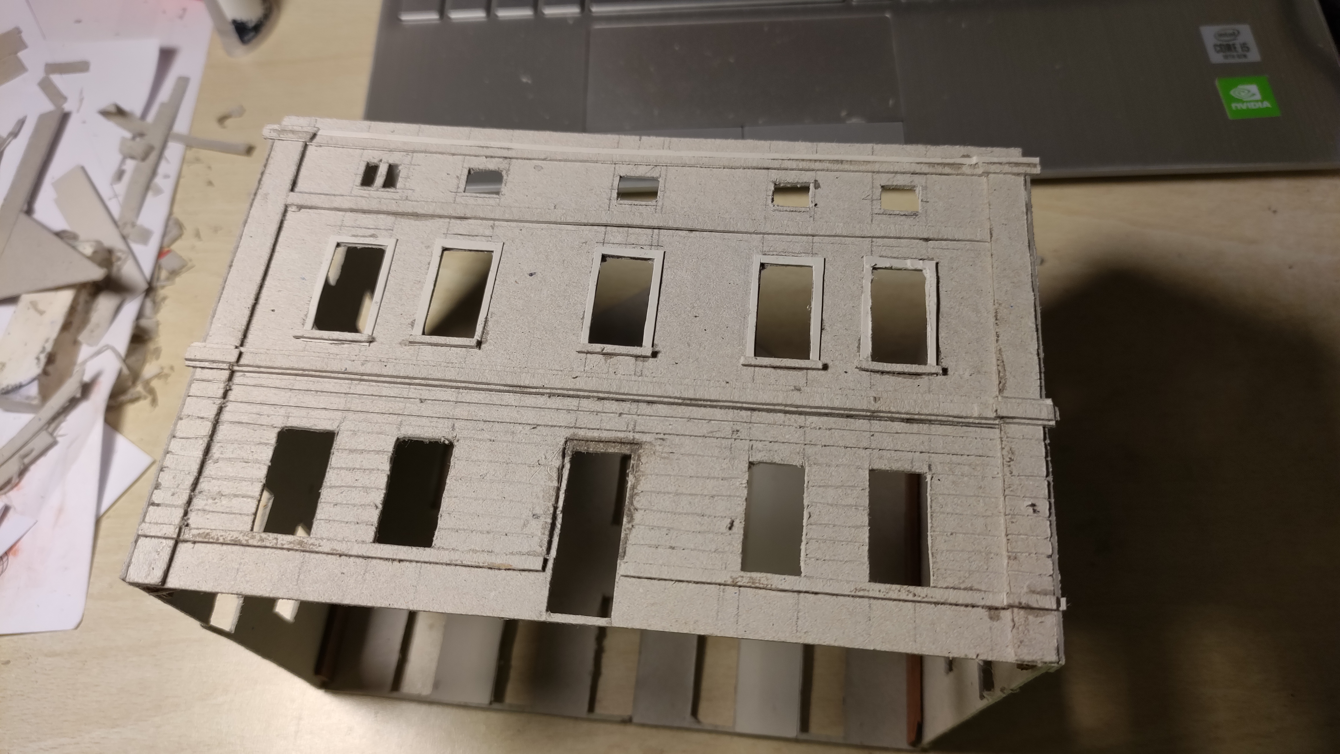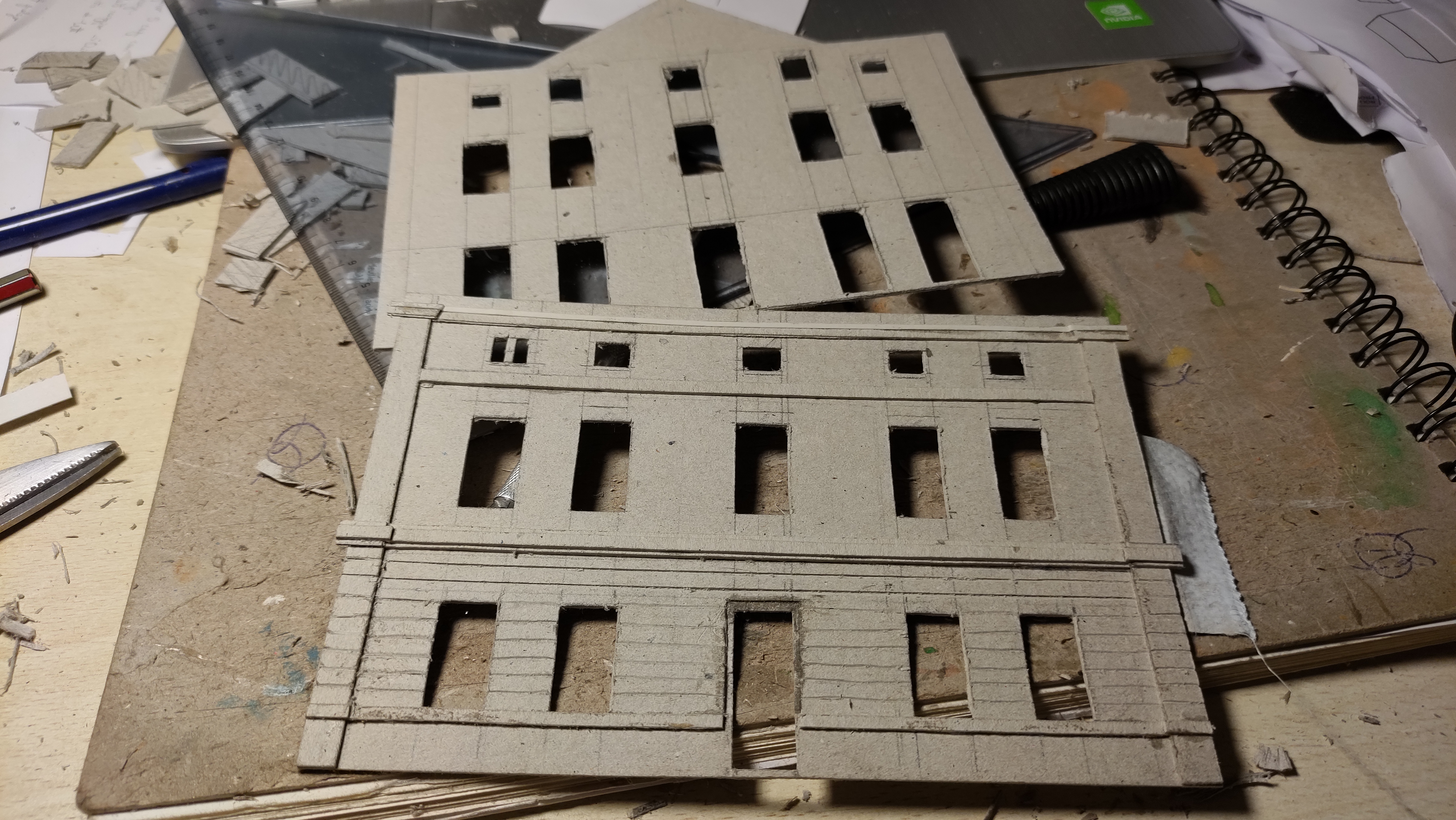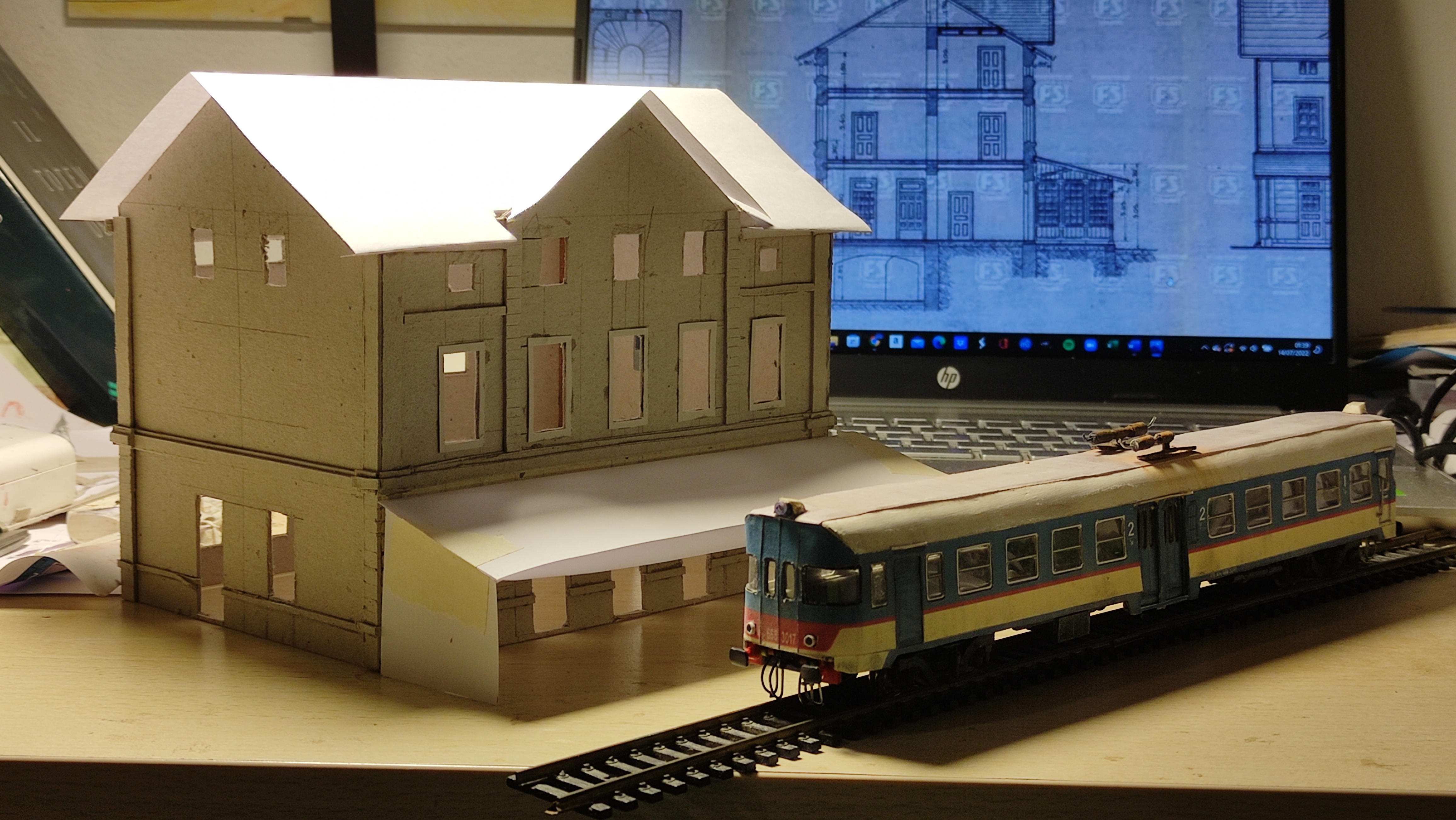 Ieri sera sono andato un po' avanti e, concentrandomi l'edificio della stazione, ho ricontrollato un po' di misure e cominciato a ritagliare le aperture di 3 dei 4 lati. Poi, per vedere l'effetto, ho iniziato a dettagliare un po' la facciata lato strada.