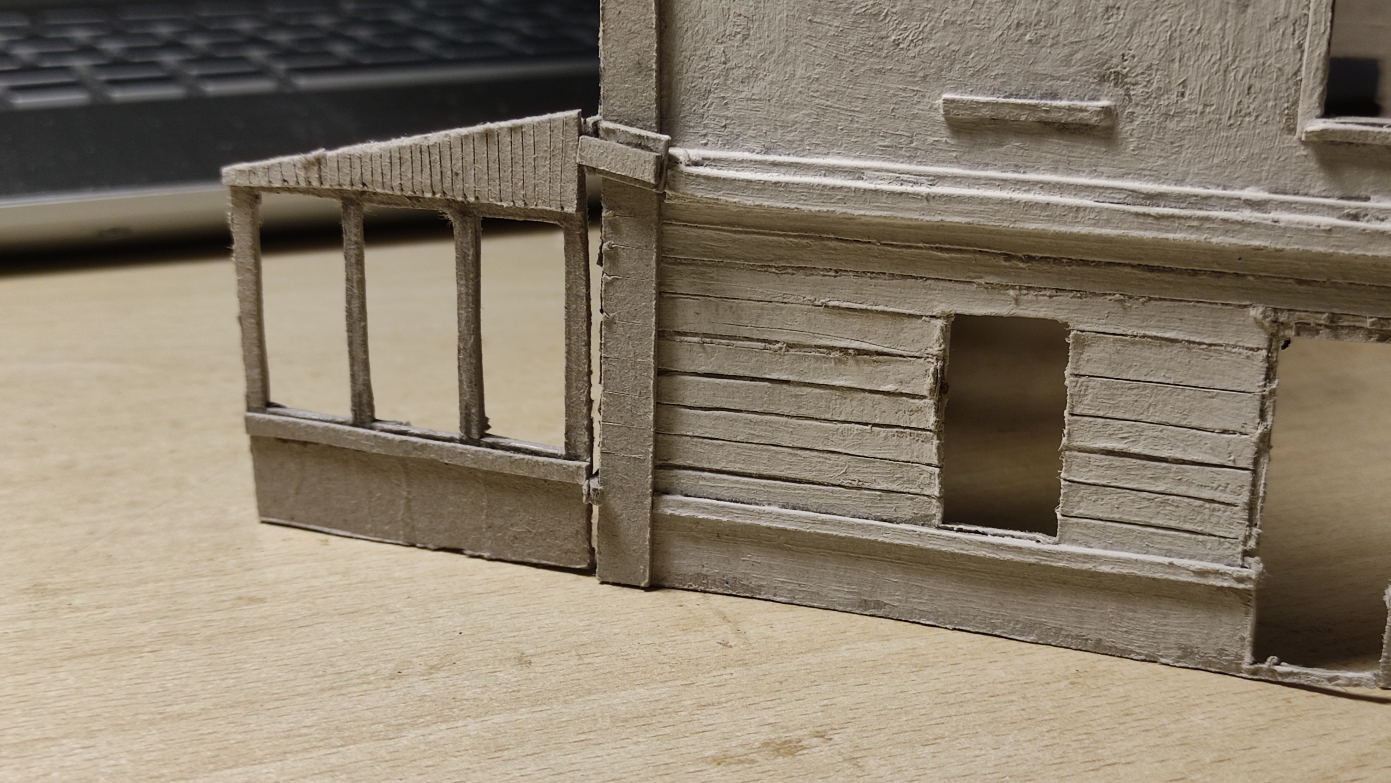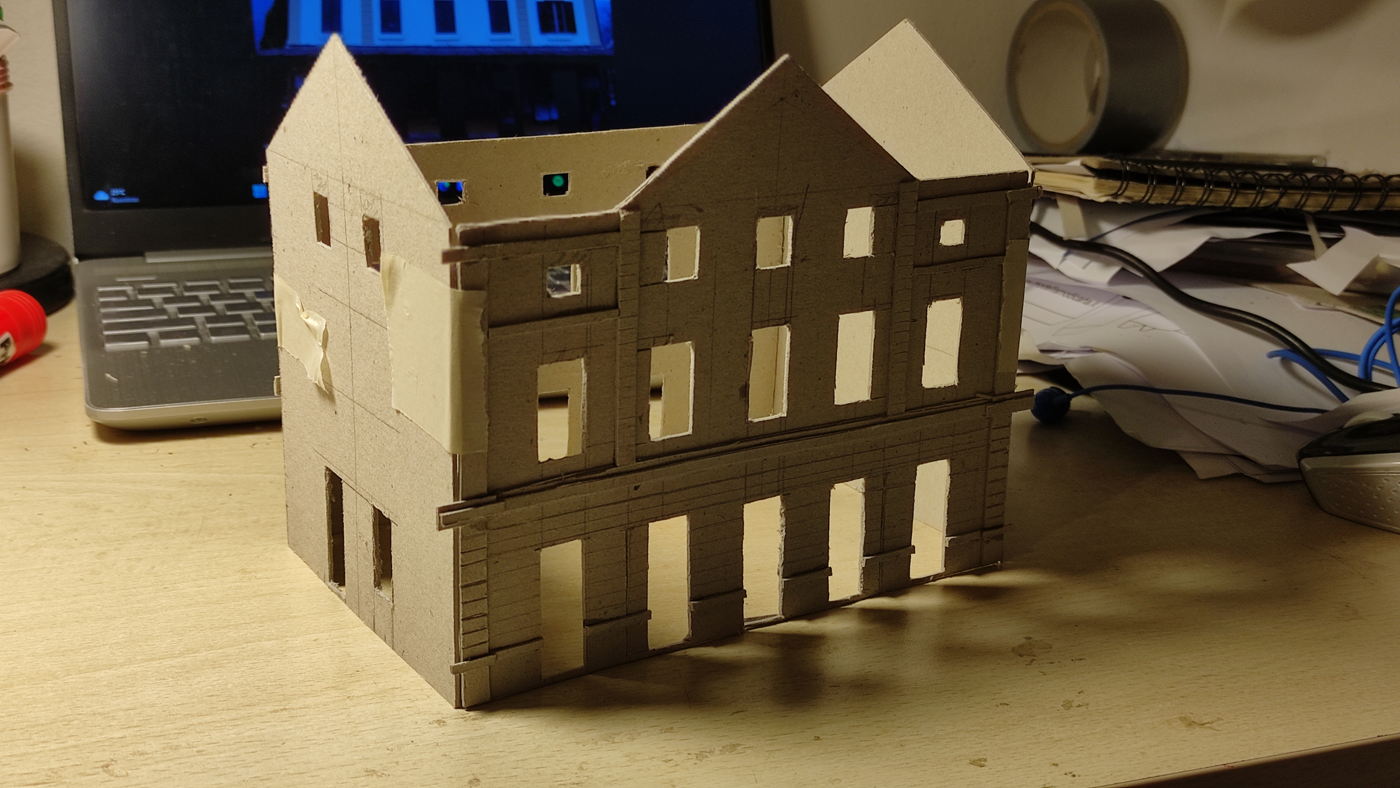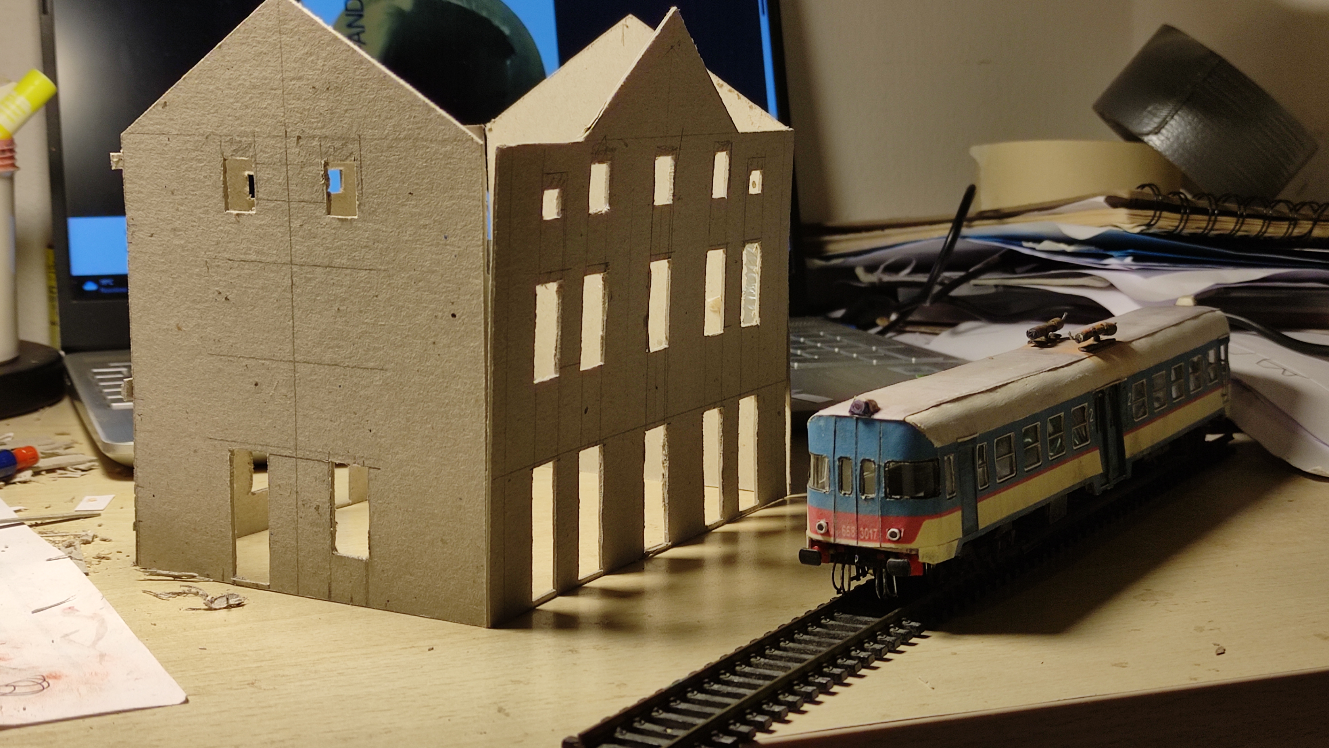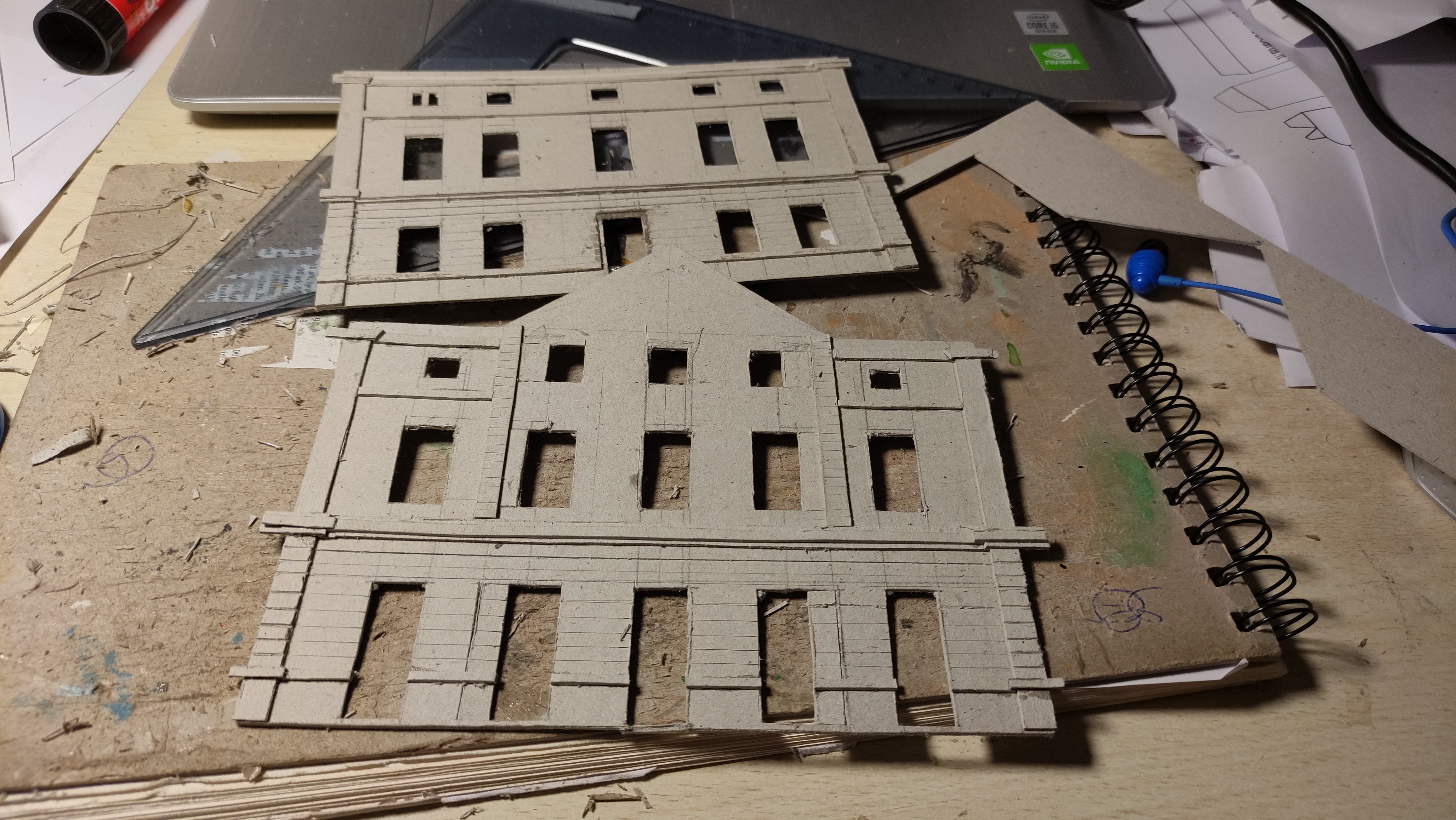 Ieri sera sono andato un po' avanti e, concentrandomi l'edificio della stazione, ho ricontrollato un po' di misure e cominciato a ritagliare le aperture di 3 dei 4 lati. Poi, per vedere l'effetto, ho iniziato a dettagliare un po' la facciata lato strada.