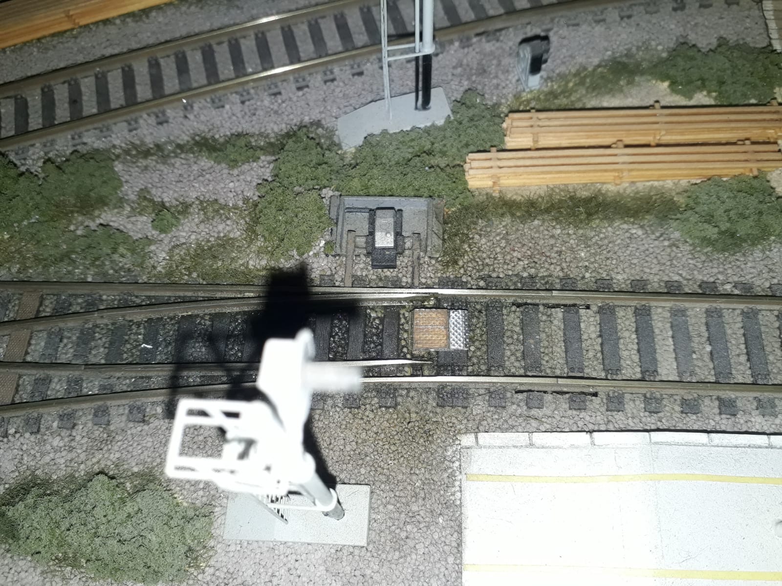Detto questo alla fine i problemi maggiori si sono verificati solo su tre scambi degli 11 totali; in prima battuta ho provato sostituendo i motorini anche un paio di volte, in un caso ho provato a sostituire l'intero scambio. Dopo poco il problema si è manifestato però sempre negli stessi punti, a dimostrazione che è principalmente un problema di scambio non perfettamente in piano ed aghi che tendono ad impuntarsi. Su 2 dei 3 scambi problematici ho risolto limando le traversine sotto gli aghi e lubrificando di tanto in tanto lo scambio con qualche goccia di olio per macchine da cucire. Sul terzo scambio dove si è probabilmente completamente snervata la levetta di plastica ed il meccanismo di ritorno ho optato per una soluzione più drastica ed ho montato un servomotore. Gli scambi non sono predisposti per i servomotori quindi mi sono dovuto inventare una soluzione: il servomotore fa ruotare una ruota dentata di plastica (mascherata con un pezzo di plastica a simulare una sorta di tombino/paratia) che scorre in una guida dentata solidale incollata alla traversa mobile dello scambio.