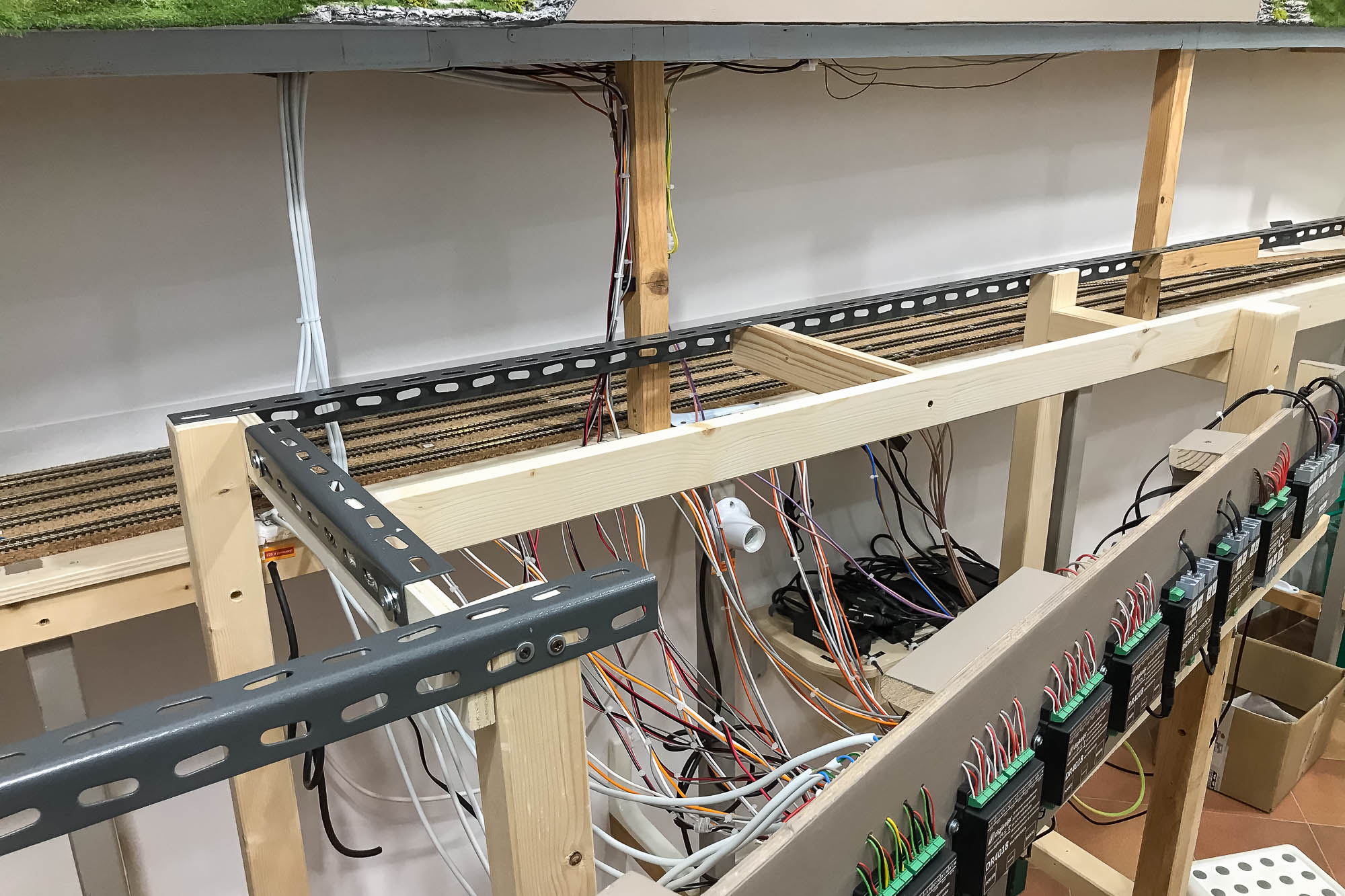 Io farei una struttura con il multistrato (piano posa binari) appoggiato su due mensole ai lati con dei riferimenti per il corretto posizionamento (spine o altro). Una volta posizionato, si agganciano anche le scarpette scorrevoli e poi lo fisserei da sotto con un paio di viti per parte. Prevederei anche una connessione elettrica per garantire l’alimentazione con un connettore o, ad esempio, tramite le spine di corretto posizionamento.