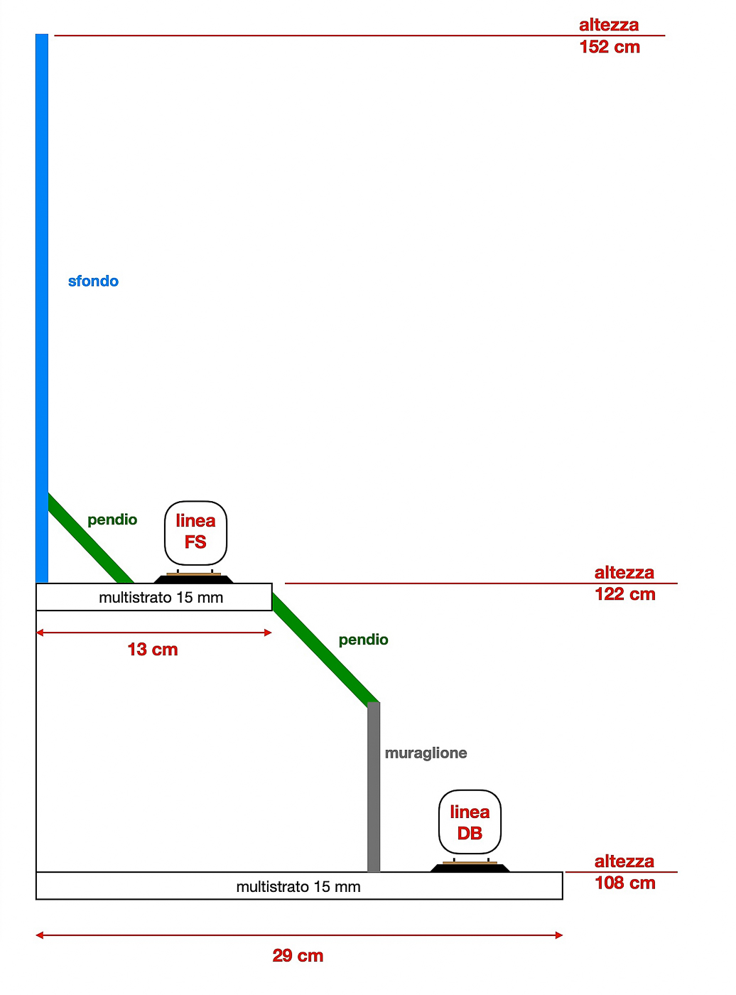 Il piano appoggia su due basi o guide solidali con la parte fissa della struttura (in rosso). In fase di costruzione il piano sarà appoggiato a queste basi e fissato al resto della struttura con sistemi che ne garantiscano l'inamovibilità (cerniere o altro). Sarà tua cura, in fase di realizzazione, fare in modo che tutta la scenografia, i binari e lo sfondo siano separabili lungo i bordi del piano amovibile.