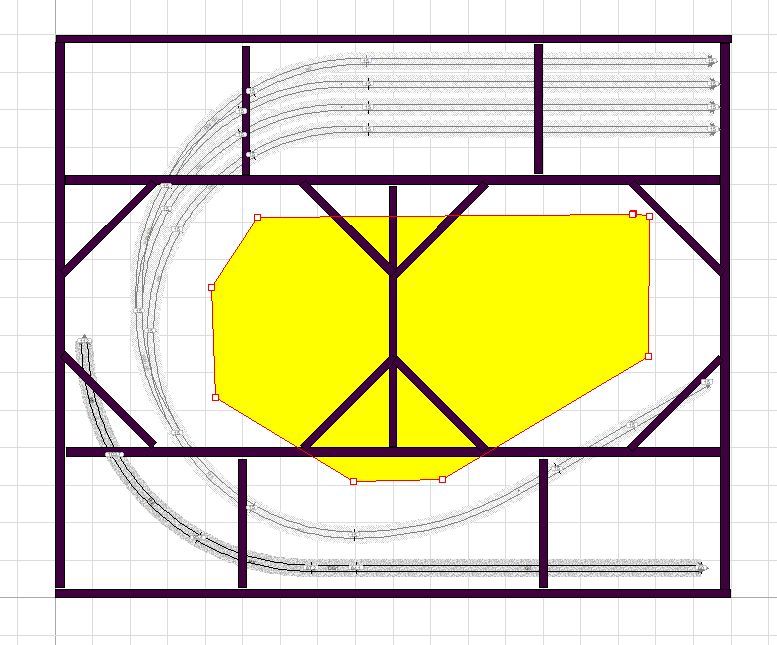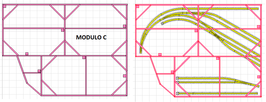Ad esempio, il modulo B dovrebbe avere una zona di telaio non coperta e di libero accesso dal basso più o meno rappresentata dalla zona gialla dell'immagine successiva. Da detta apertura si può accedere dal basso a quasi tutti i binari nonostante la presenza di qualche listello del telaio. Si lascia un certo margine di superficie coperta di sicurezza ai lati dei binari per evitare cadute dei rotabili in caso di svio.