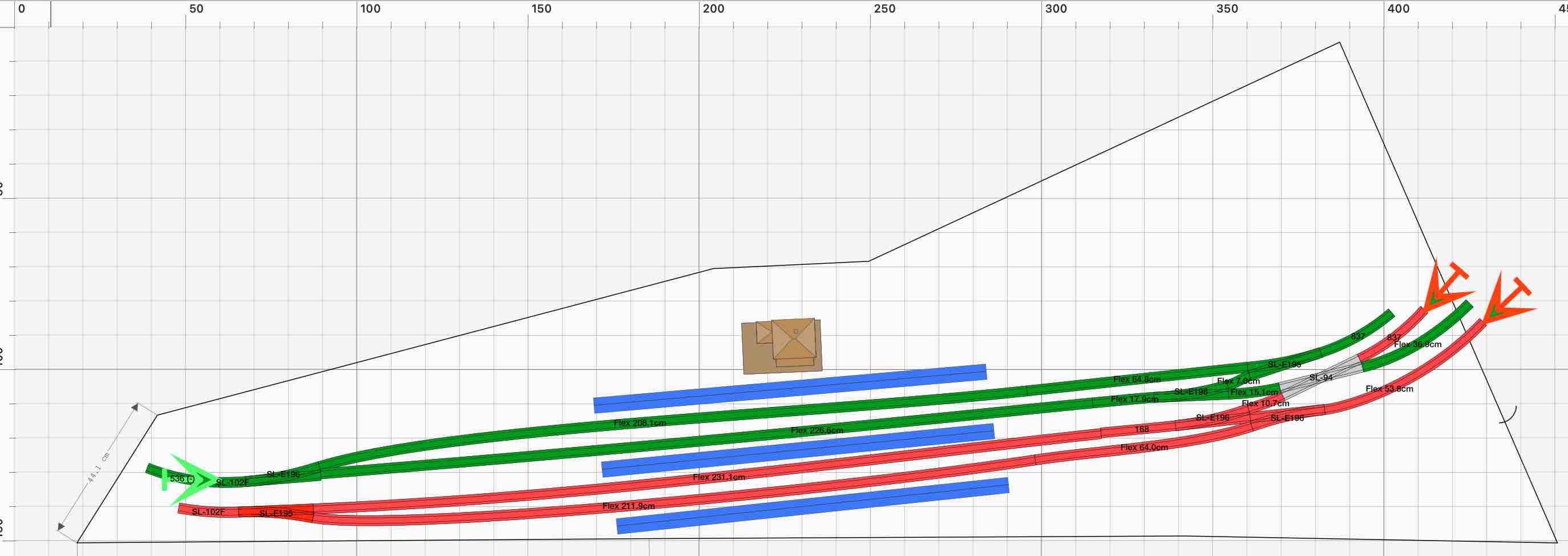 Nel tracciato in verde mi riferisco in particolare a quello più in alto. Quello sottostante tre i due binari rossi potrebbe ospitare qualche locomotore isolato per le manovre di stazione.