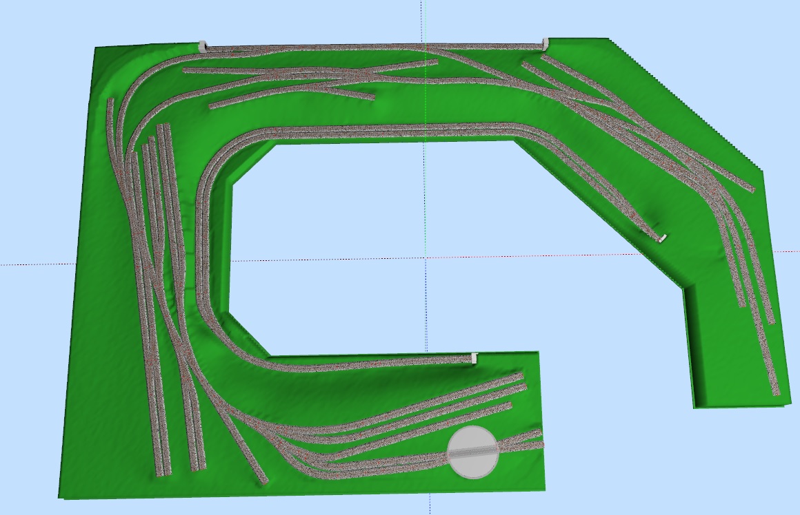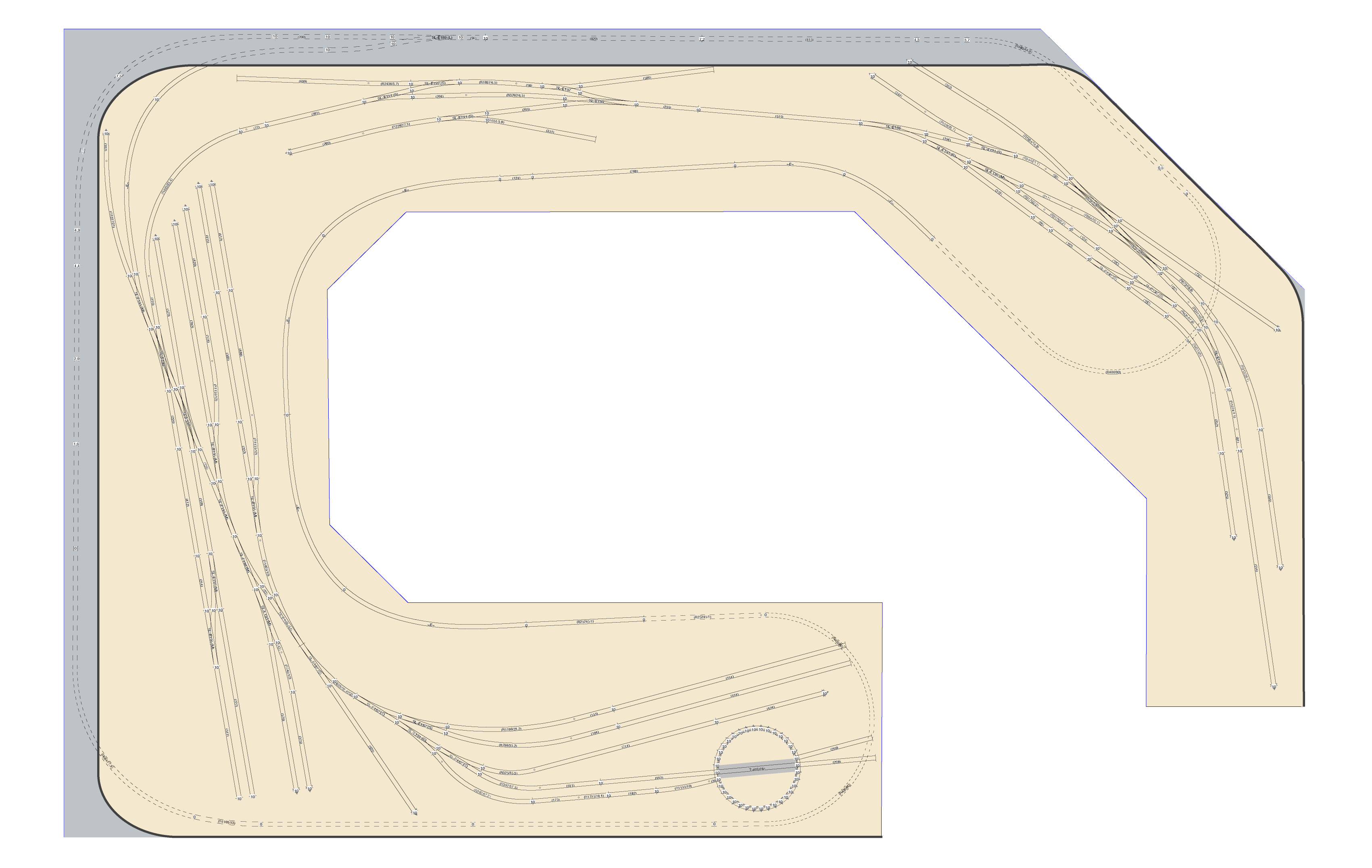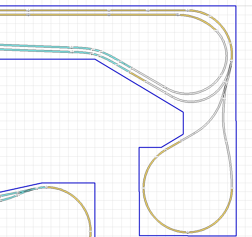 La linea di parata, per la maggior parte nascosta (le parti in azzurro), mi serve per far girare i treni in tondo come da bambino e non mi importa se non è ben collegata al resto del plastico.