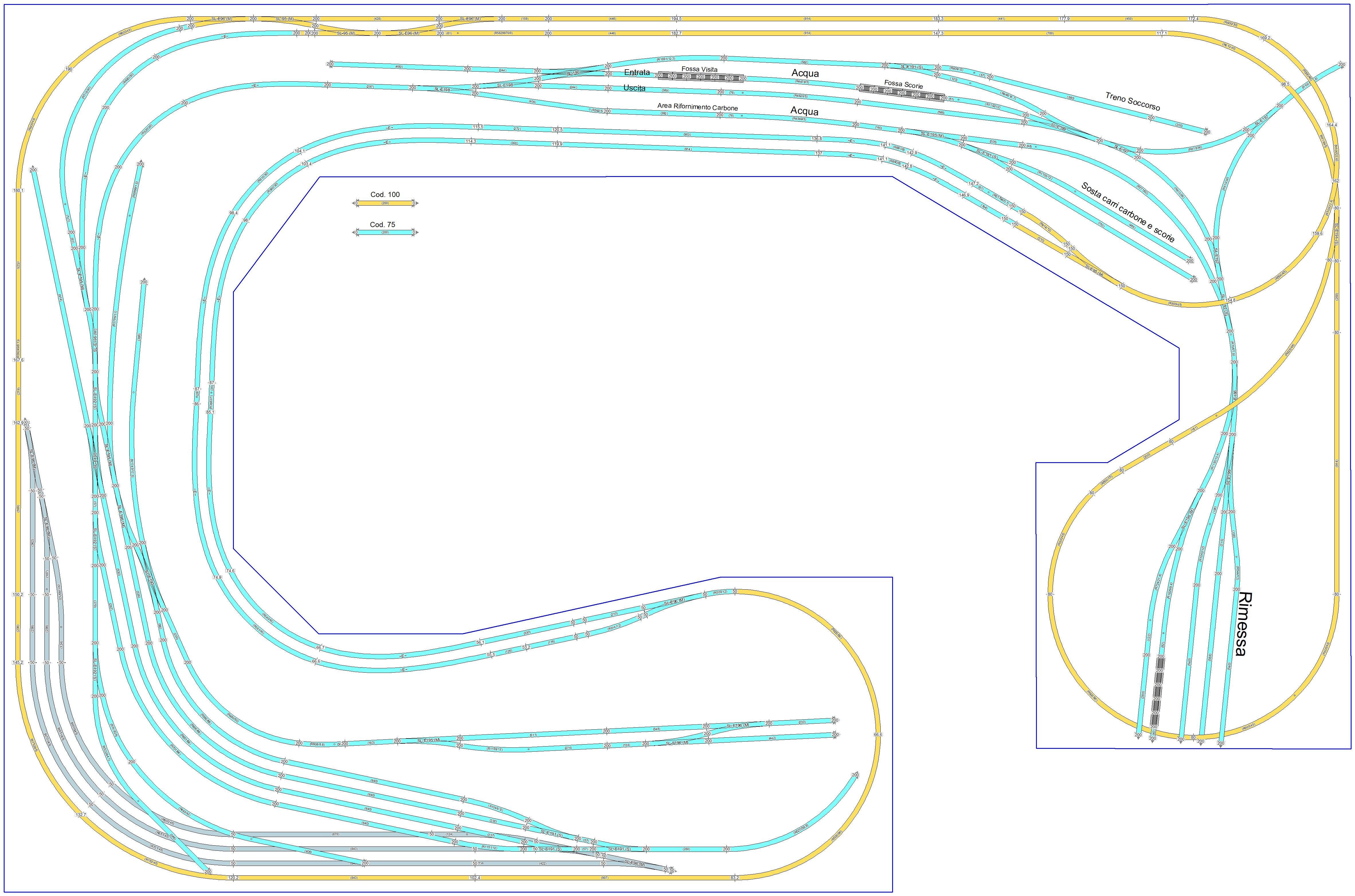 Ho provato semplicemente a rifare l'anello con doppia comunicazione alla linea principale, così da poter entrare/uscire in entrambe le direzioni; ho posto la linea inferiore a 11 cm da quella superiore e ho fatto un raddoppio della linea più che altro per far vedere che in quel tratto potresti mettere altri binari paralleli per formare una stazione nascosta per la sosta di alcuni convogli per un'alternanza di esercizio.