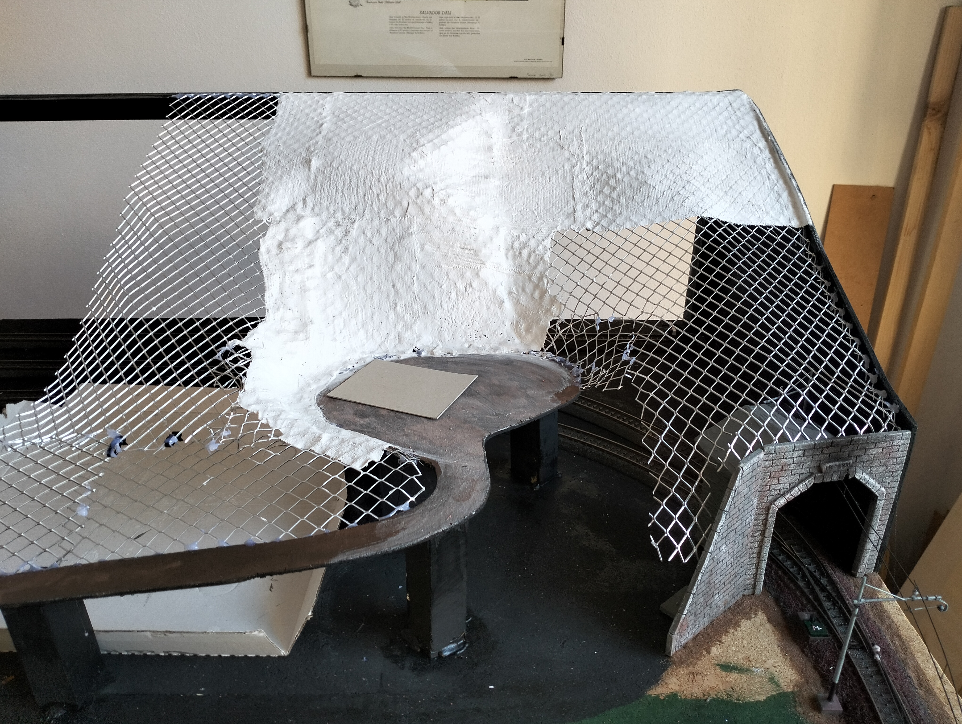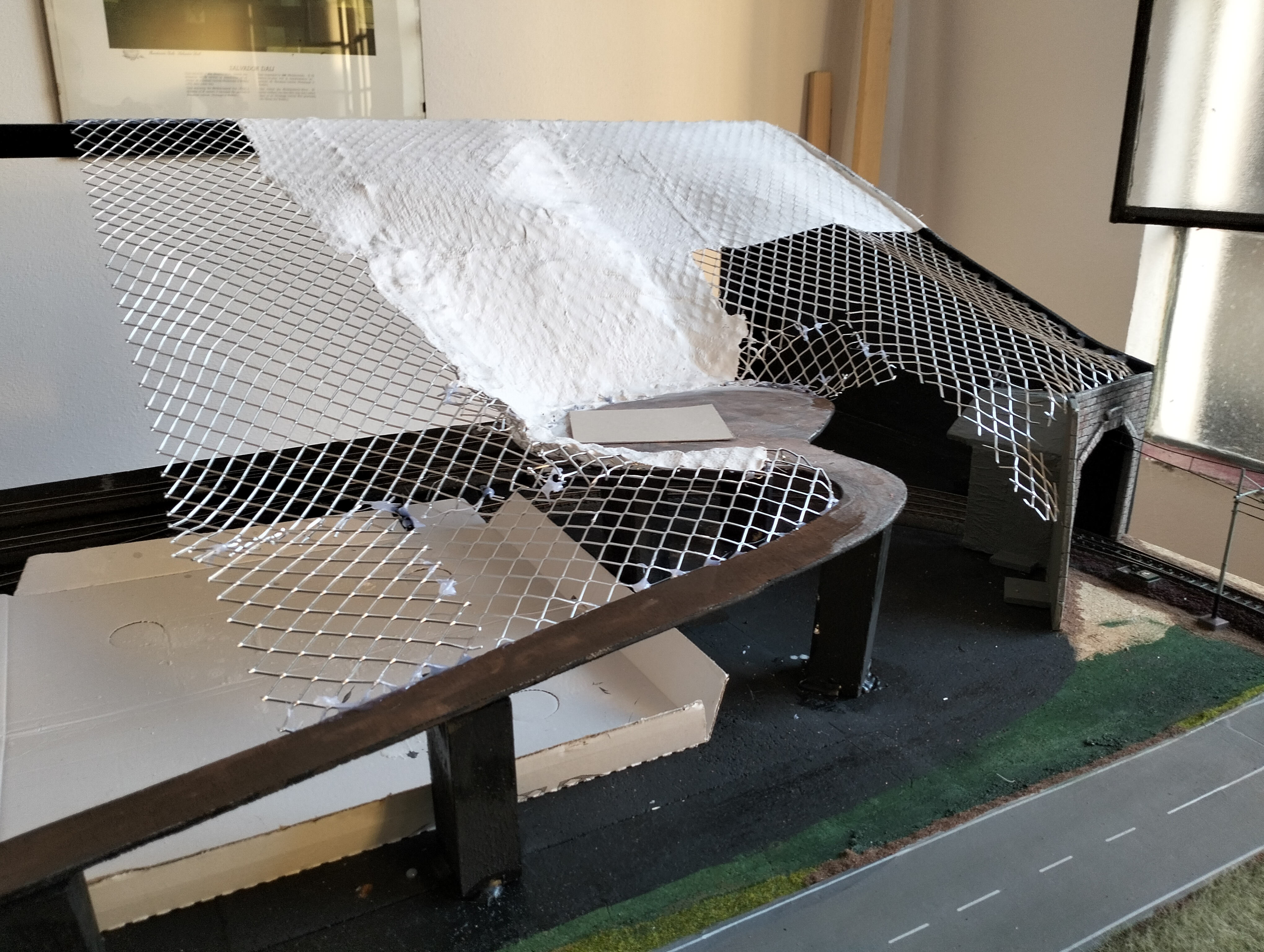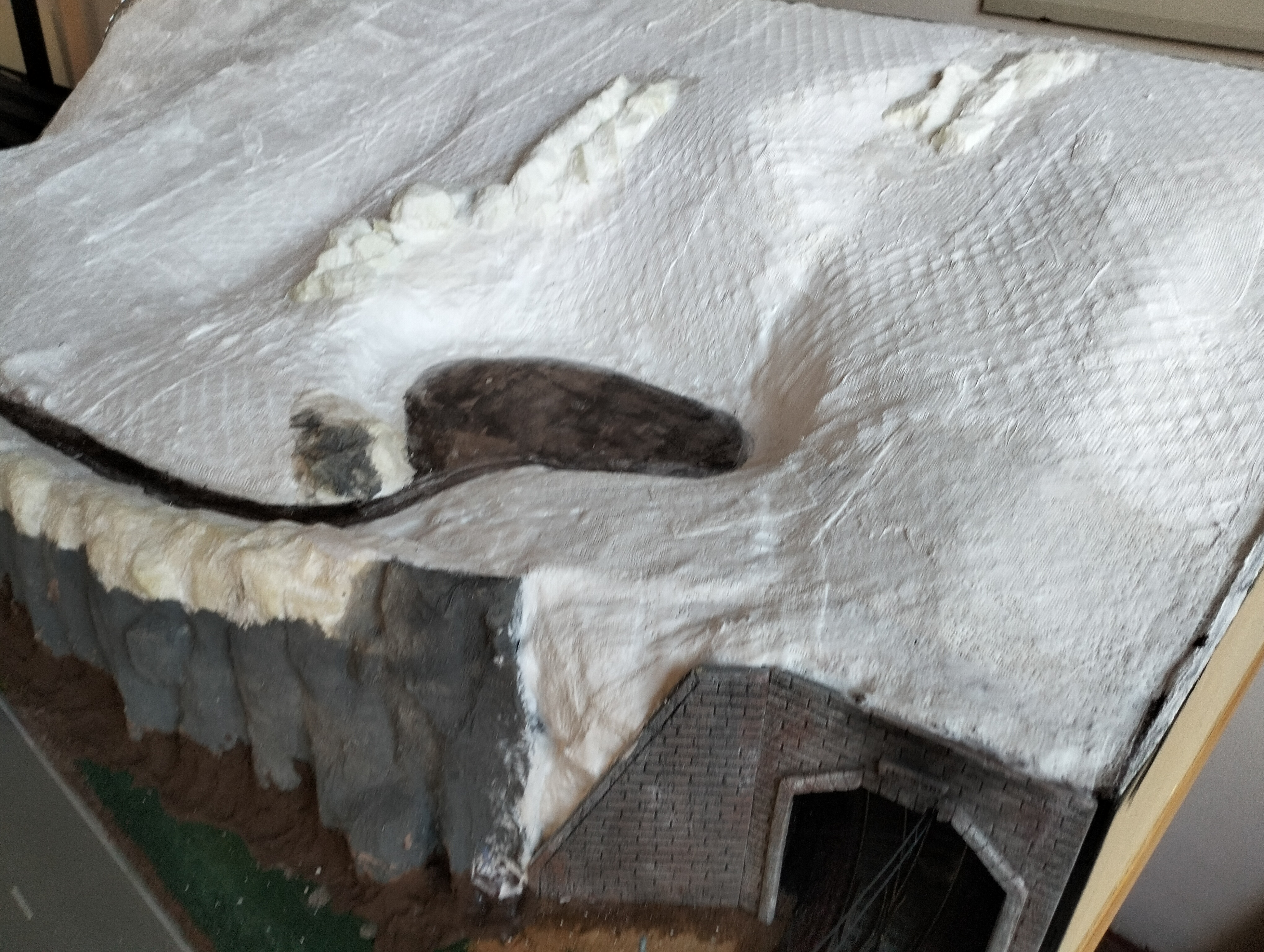 altro bel lavoretto la scenografia, un consiglio: dopo l'ottimo primo strato di garza gessata, per togliere quell'antiestetica tramatura della rete sottostante dovrai stendere "malamente" ulteriori strati di carta cucina con acqua e vinavil, così oltre a togliere la trama dai ulteriore movimento al terreno e una più consistente base anche per il fissaggio di alberi.