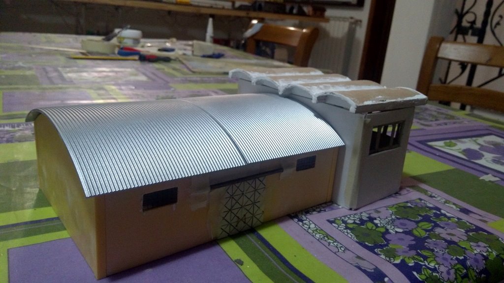 Ho realizzato le aperture per le porte e finestre e dopo la prima prova del tetto precedentemente realizzato ho notato alcune imperfezioni di costruzione quindi ho deciso di rifare ex nuovo anche quello sempre con cartone e listelli di legno, alcune stuccature come vedrete hanno già ricevuto una prima mano di limatura, altre sono ancora da lavorare.