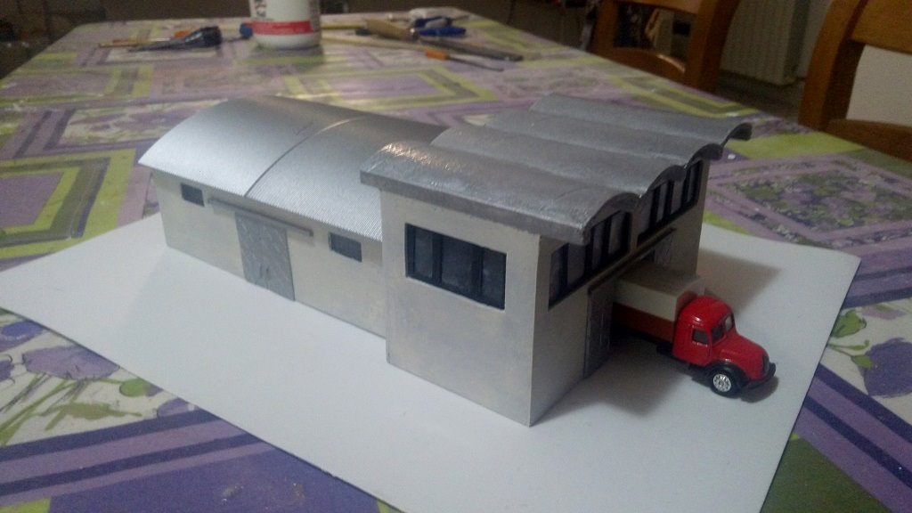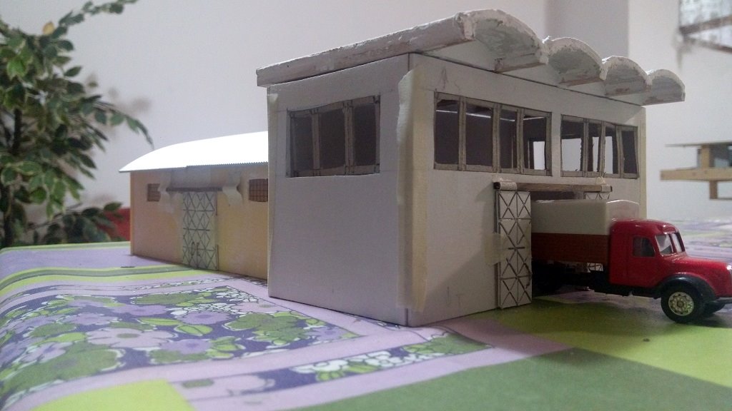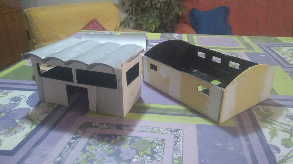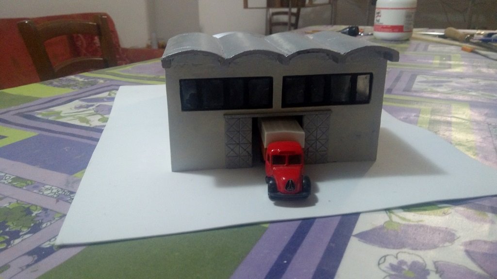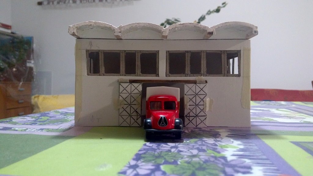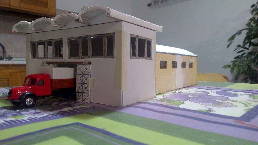 Realizzate le finestre in cartoncino nella parte anteriore e le porte in Forex, le guide sono un listello di legno di 2x2mm, per le finestre del capannone ho utilizzato un kit aughen.