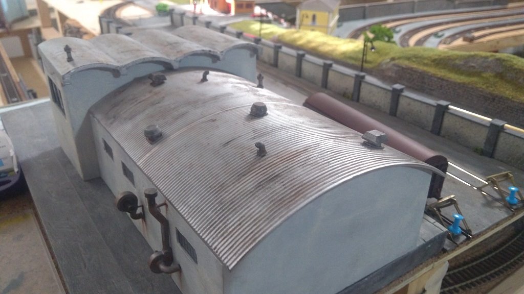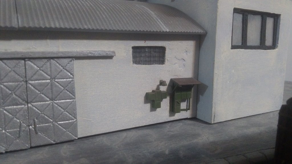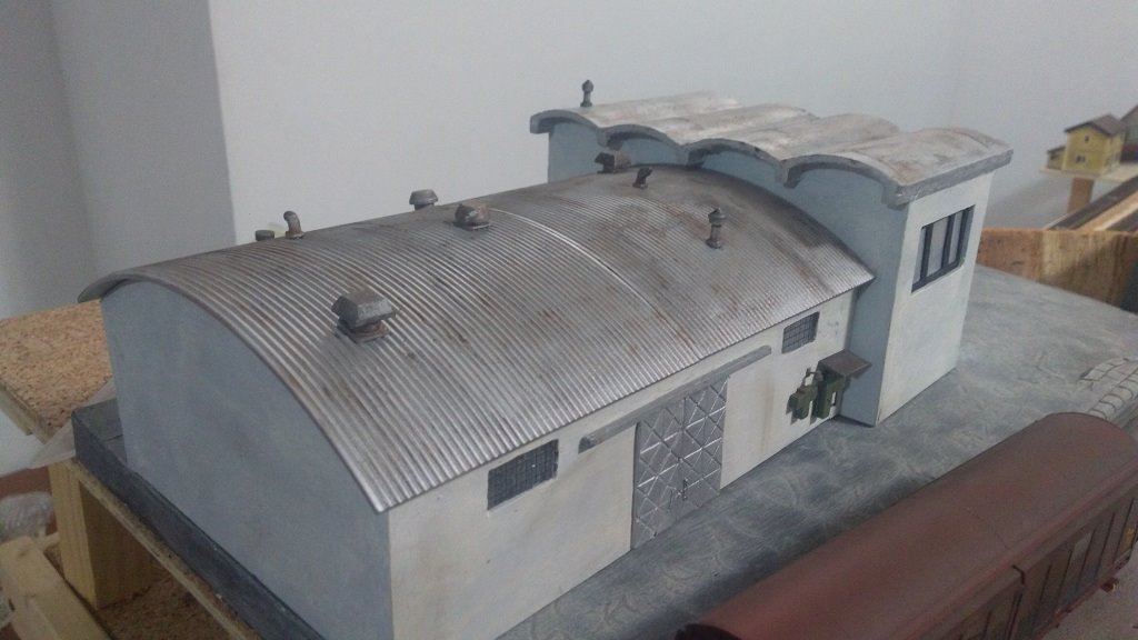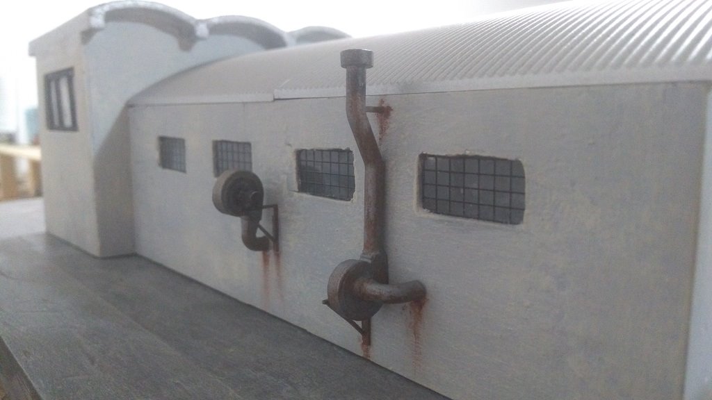 come da consigli ricevuti ho acquistato alcuni particolari auhagen per migliorare l'aspetto estetico dell'edificio, il primo particolare inserito sono stati i quadri elettrici che hanno fatto bella mostra di se in un angolo dell'edificio, i quali hanno ricevuto solamente una leggera patinatura mantenendo il colore originale. Poi sul retro ho applicato due aeratori di diversa tipologia, questi sono stati modificati in base alla struttura del mio edificio, verniciati a spruzzo color zinco e sporcati con tecnica del pennello a secco, infine una volta incollati ho realizzando le colate di ruggine sull'edificio. Sul tetto infine sono stati applicati diversi camini di diverse tipologie, tutti hanno ricevuto il solito procedimento degli aeratori, per completare il tetto ho dato una leggera invecchiatura e sporcatura. Il prossimo passo sarà l'illuminazione interna, poi con calma inserirò ulteriori particolari ai bordi dello stesso come mi era stato consigliato