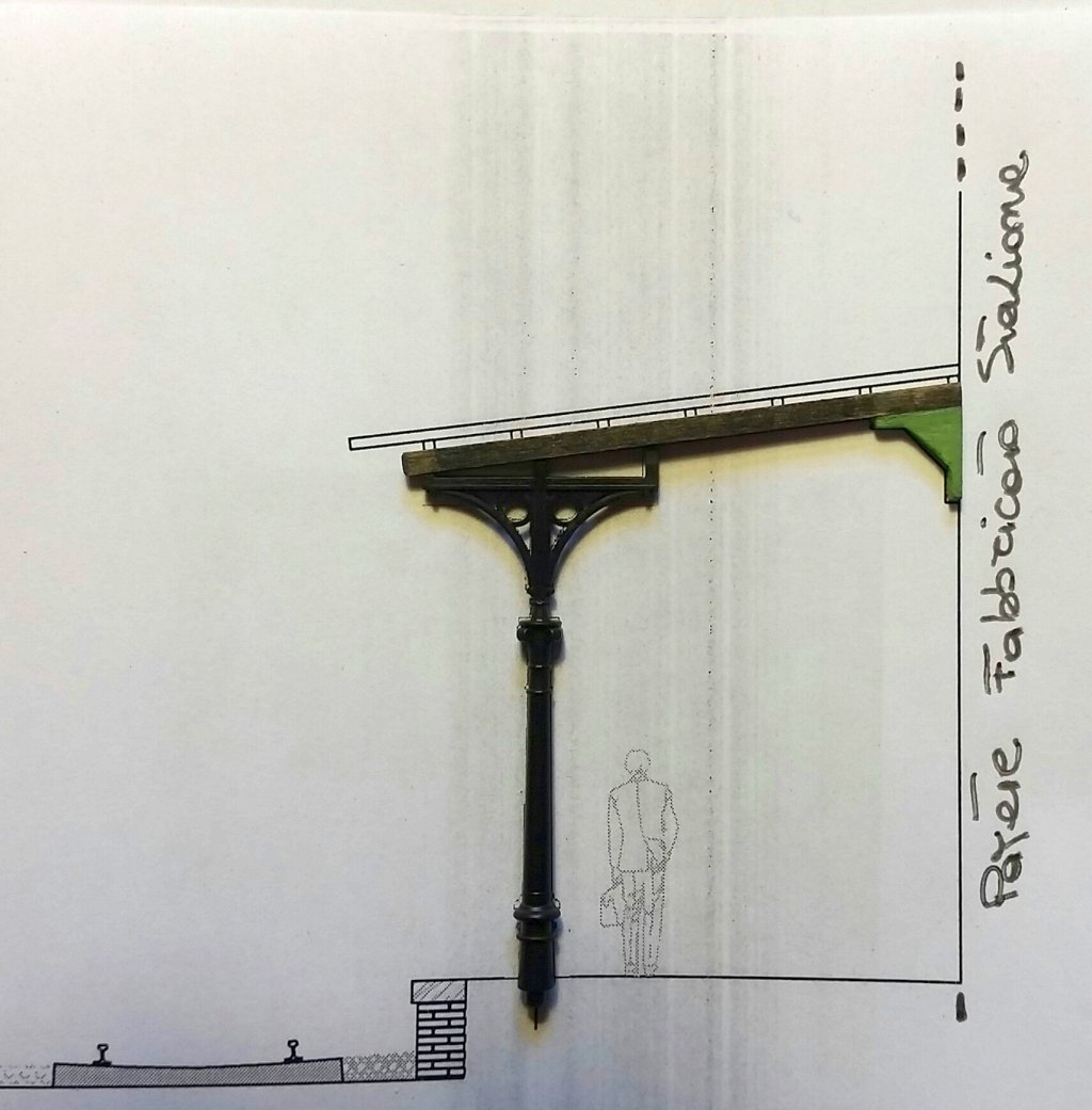 Si può considerare, invece, pressochè ultimata la pensilina del marciapiede in porfido posizionato tra i binari 1 e 2. E' autocostruita, ad eccezzione delle colonne (di derivazione commerciale) che sostengono il tetto in legno a capriate.