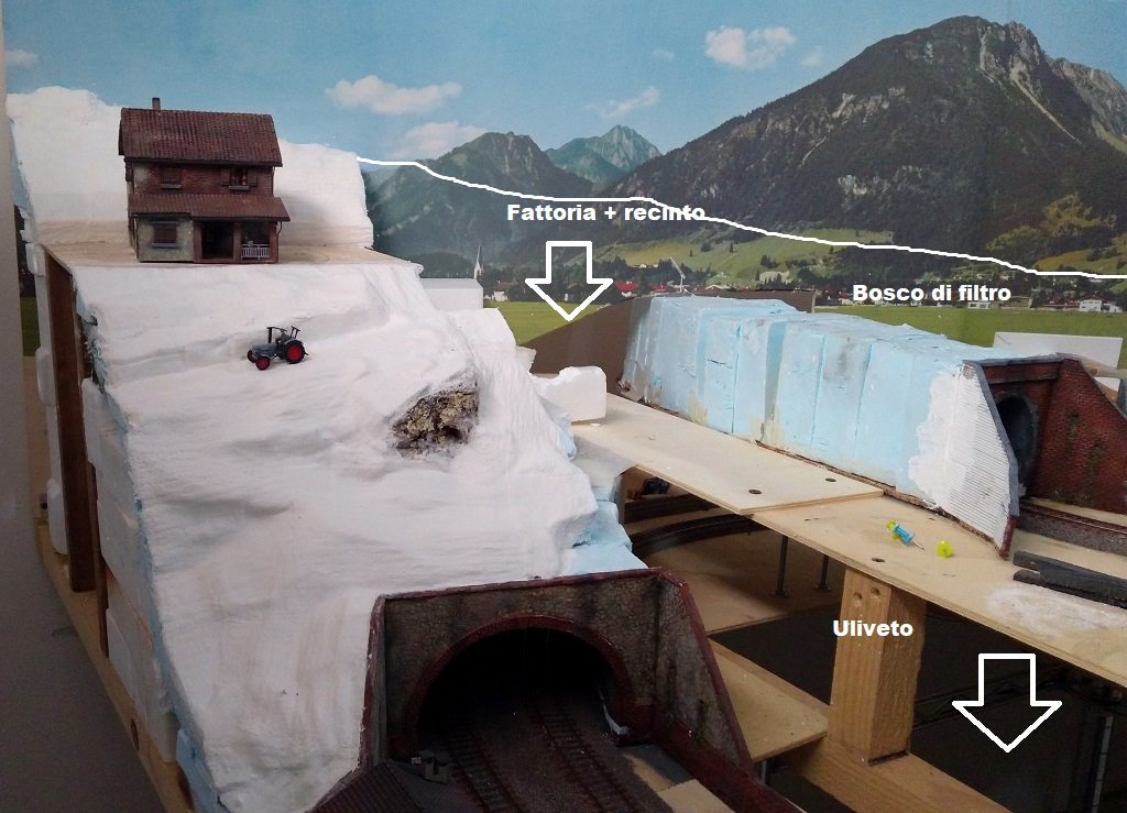 Grazie Egidio, le tue sono ottime considerazioni, infatti il lavoro procede abbastanza lentamente perché cerco di valutare attentamente ogni zona che vado a creare sfacendo e rifacendo finché non sono convinto a pieno proprio per non creare l'effetto da te citato ma delle linee maggiormente mosse come al vero, ora come spiegato sulla destra verrà collocata la stalla presentata sopra con recinto esterno e a seguire ci sarà un filtro boschivo sopra la zona di due portali(ferroviario e stradale) che dividerà con l'ulteriore scenografia pensata per proseguire verso destra, l'ortografia del territorio vedrà la montagna che scende dolcemente da sinistra verso destra, la zona del casolare rappresenta il punto più alto, poi il tutto si dovrà inglobare in modo armonico con il tratto ancora da realizzare sulla linea di parata dove sarà presente un uliveto, un paio di foto per far capire meglio
