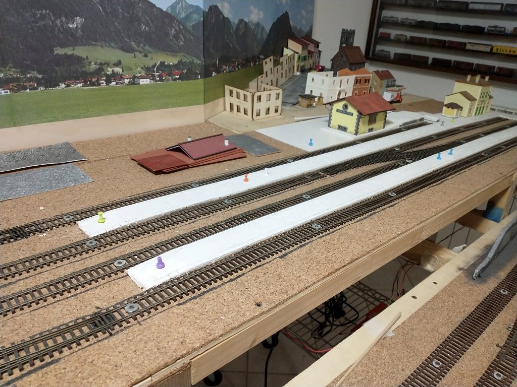 Prima di proseguire con le case della borgata ho la necessita di realizzare la base del paese e per fare ciò ho ritenuto idoneo prima delimitare l'area ferroviaria realizzando la base della stazione e del magazzino merci, visto che ci sono credo faro anche i marciapiedi, il tutto però ferra fissato una volta terminata la colorazione delle rotaie che sul piano superiore in stazione devo ancora fare ma intanto avere gli oggetti mi è utile per realizzare strade e marciapiedi del paese.
