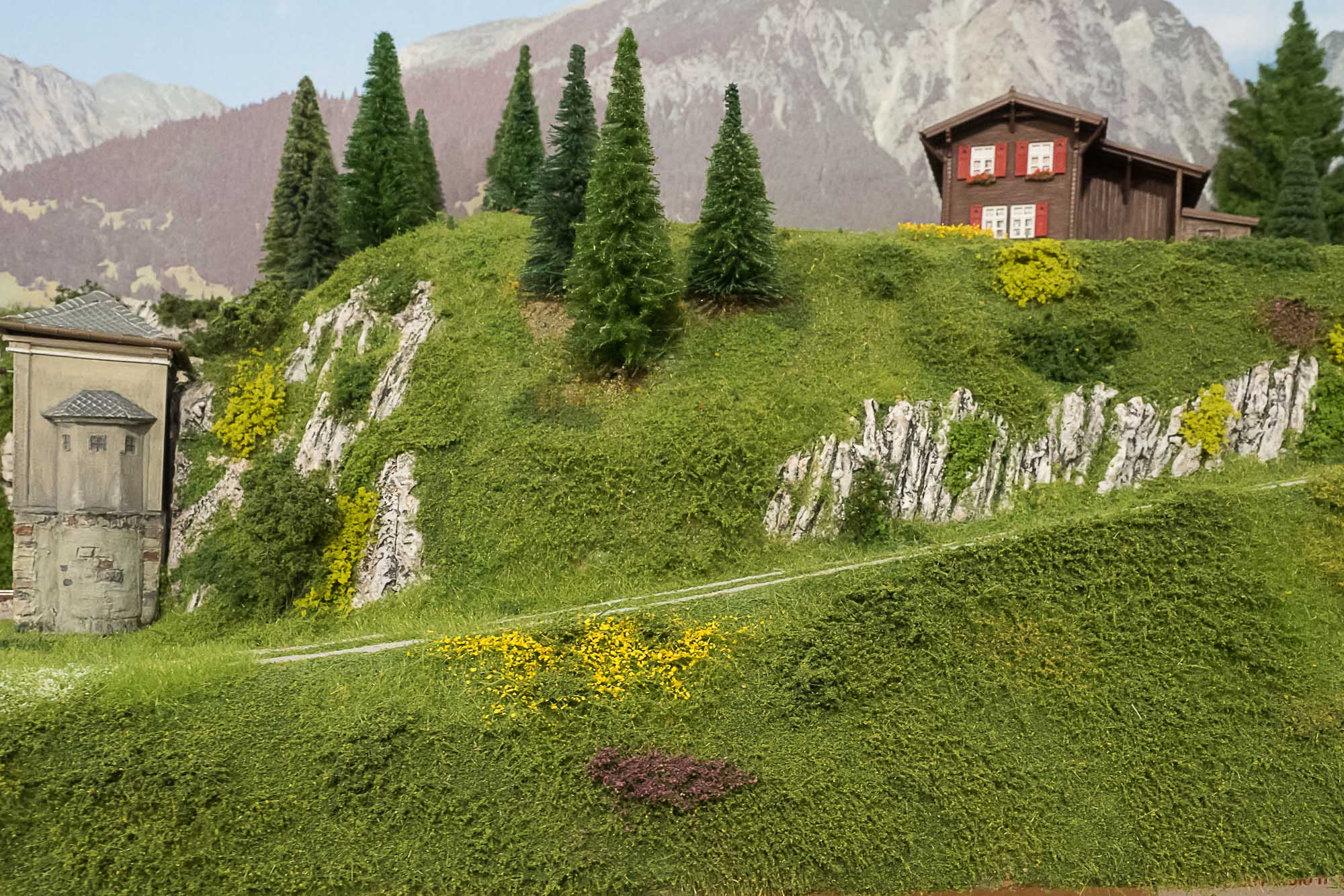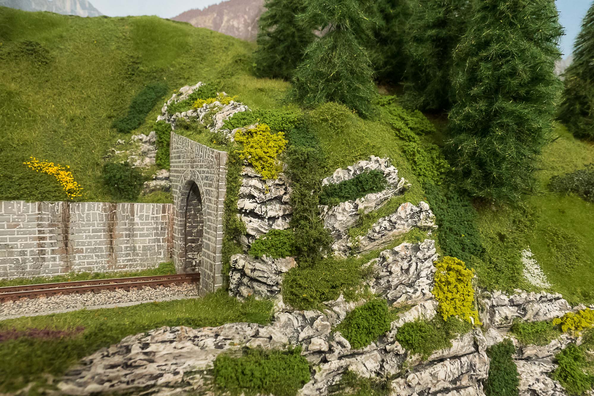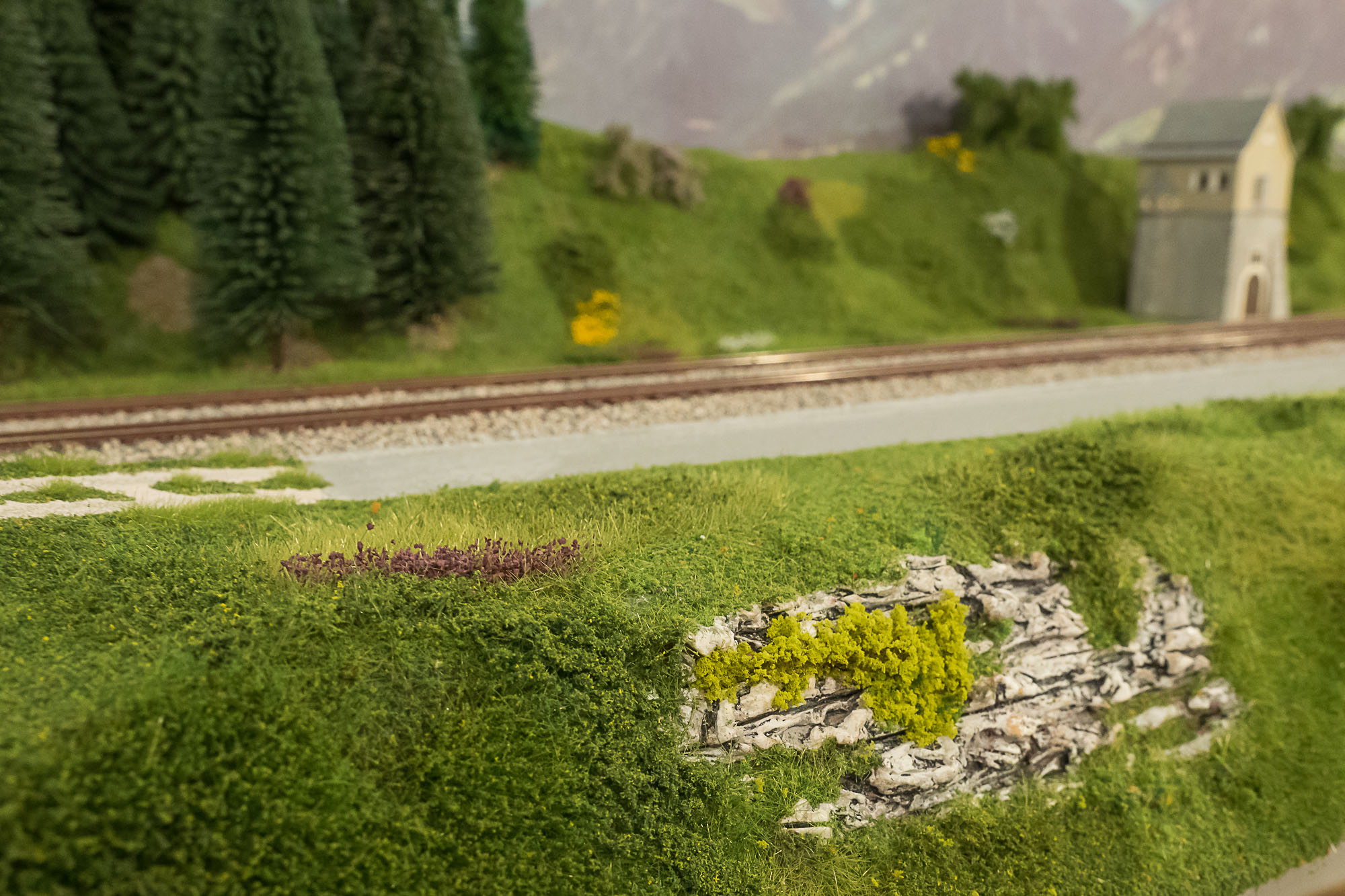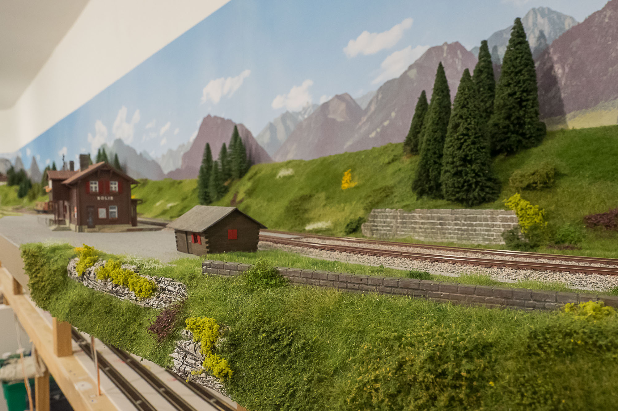 La posa della vegetazione della parte superiore del plastico, quella dedicata alle Ferrovie Retiche, è praticamente completata.