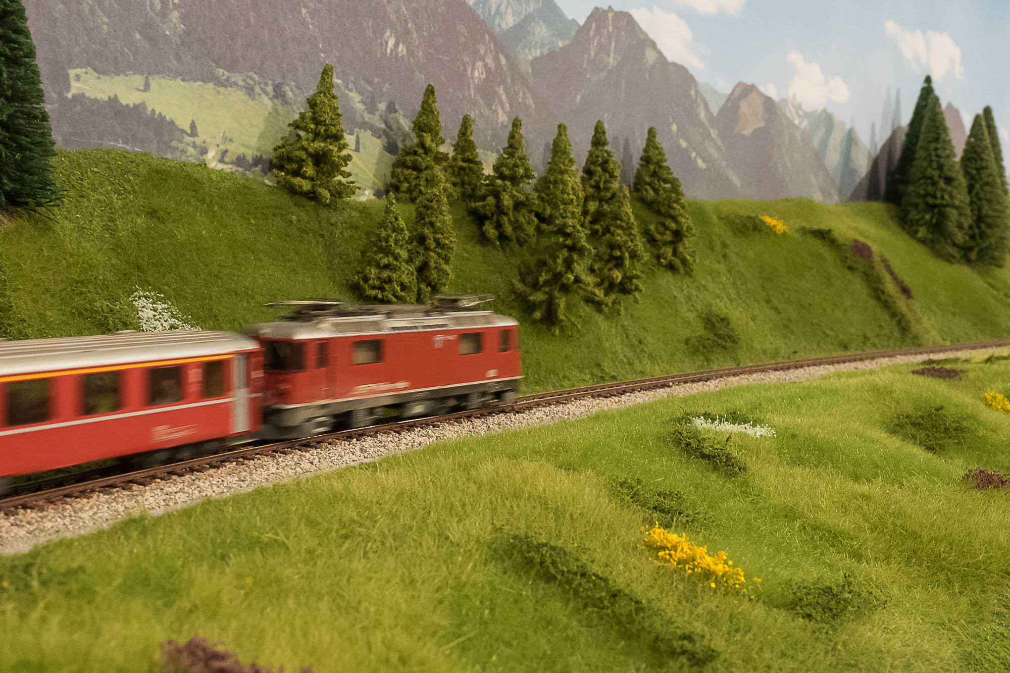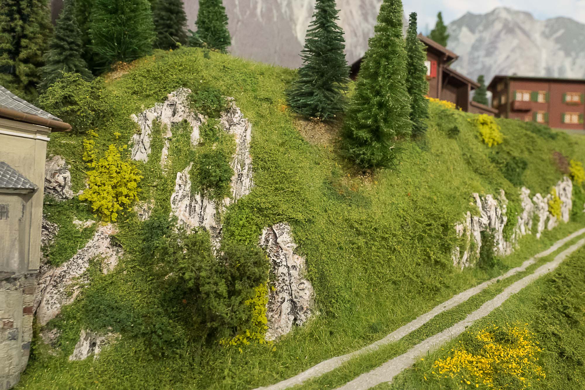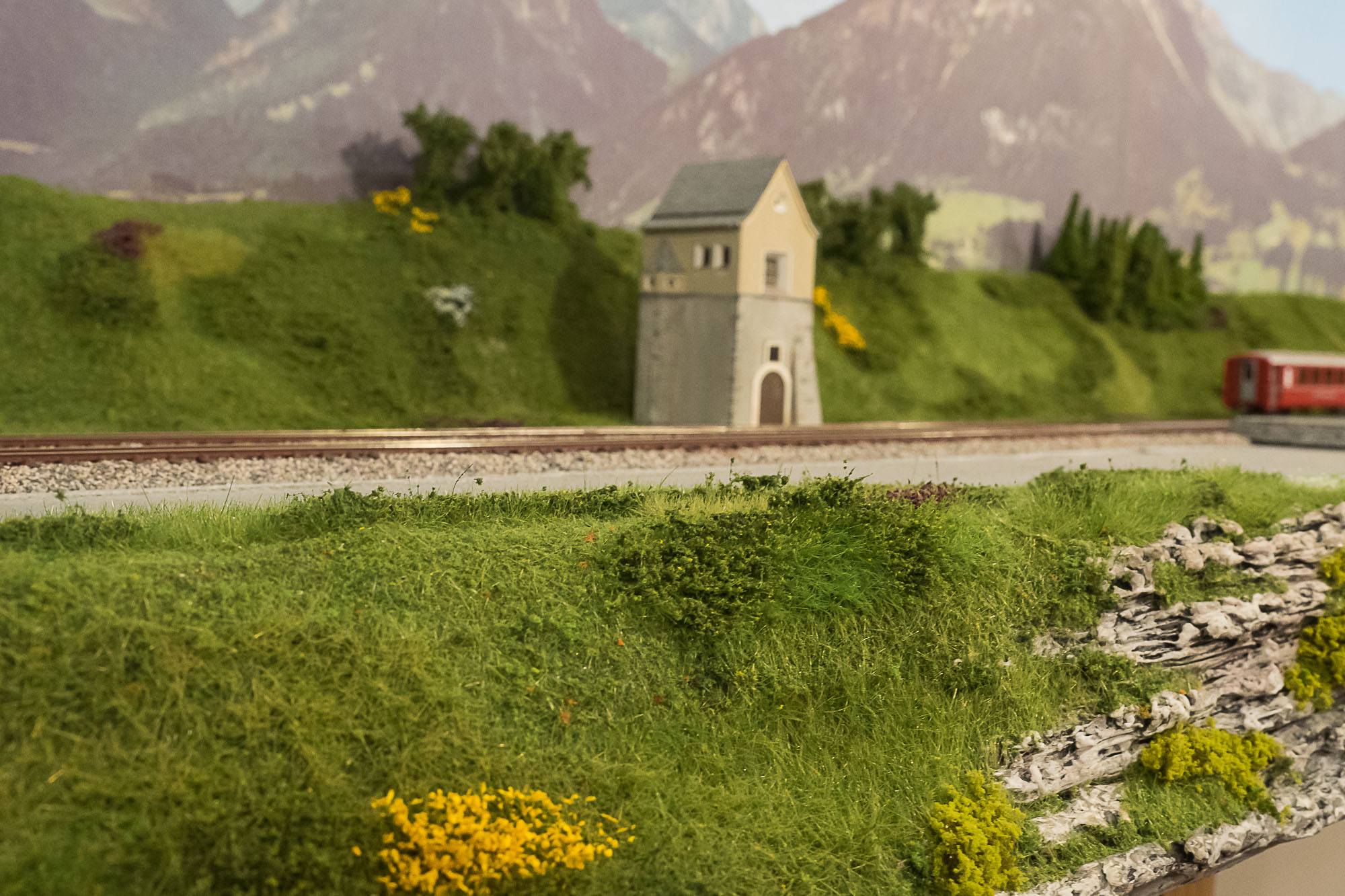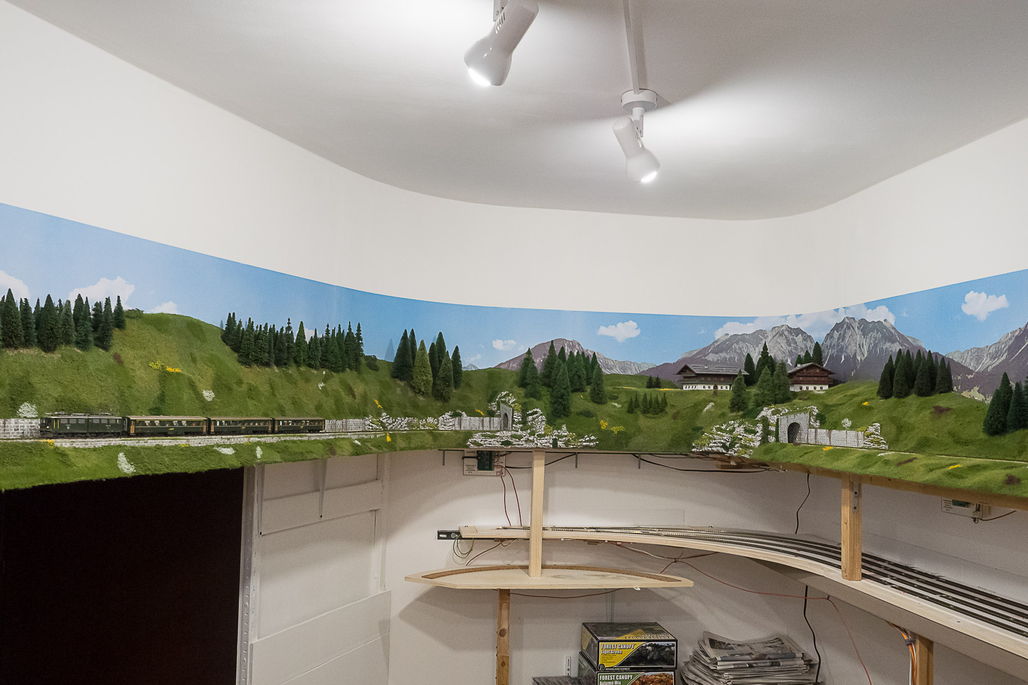 La posa della vegetazione della parte superiore del plastico, quella dedicata alle Ferrovie Retiche, è praticamente completata.