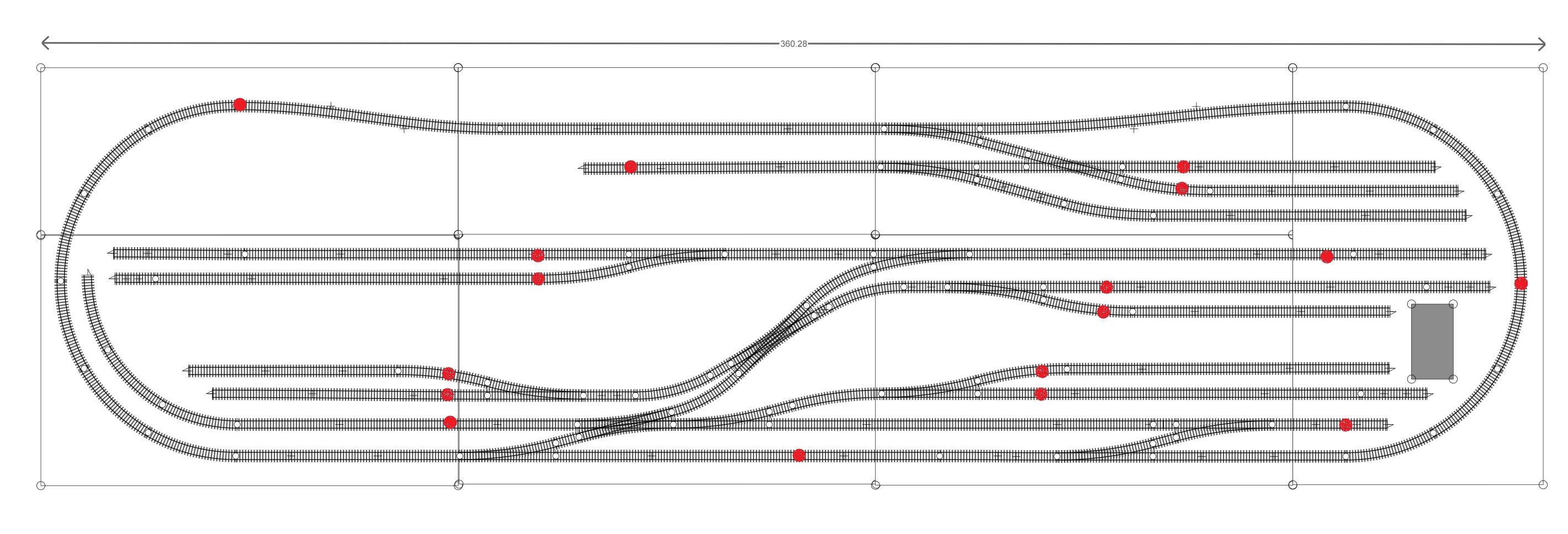 E ancora, quanti punti di alimentazione mi consigliate di fare per un plastico delle mie dimensioni per avere sempre una captazione ottimale (tenendo conto che utilizzerò locomotori da manovra a 2 assi a bassissima velocità)? Quelli riportati in rosso nel disegno possono andare bene o vi sembrano eccessivi?