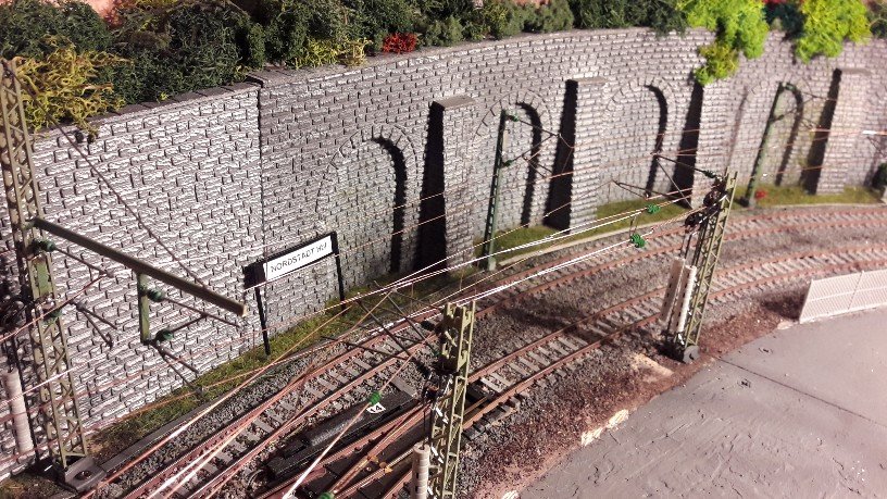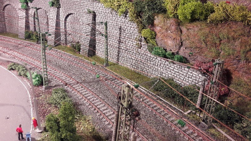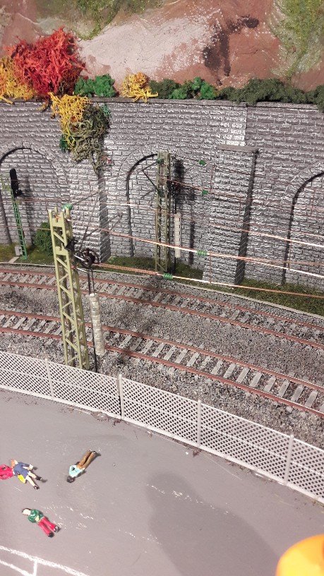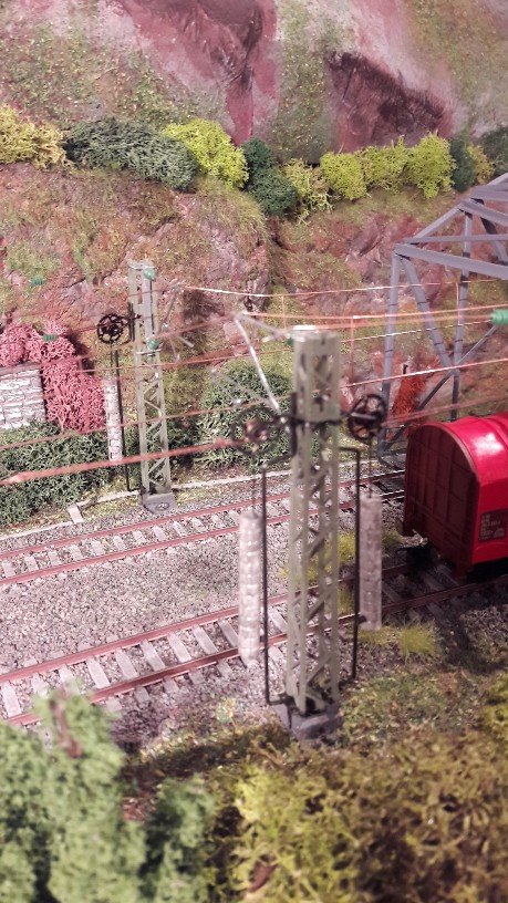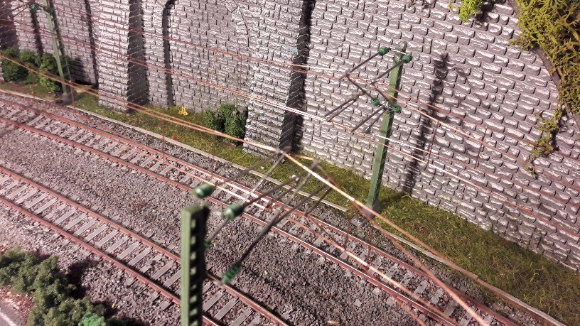 Che ne dite se vernicio anche il filo di contatto, oltre che le sospensioni ed i vari bracci dei pali di sostegno? Così color rame mi sembra troppo nuovo...