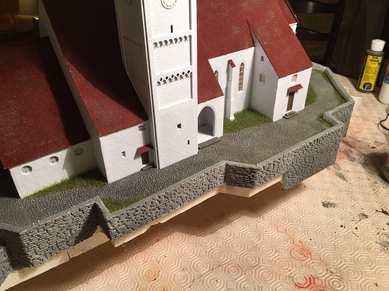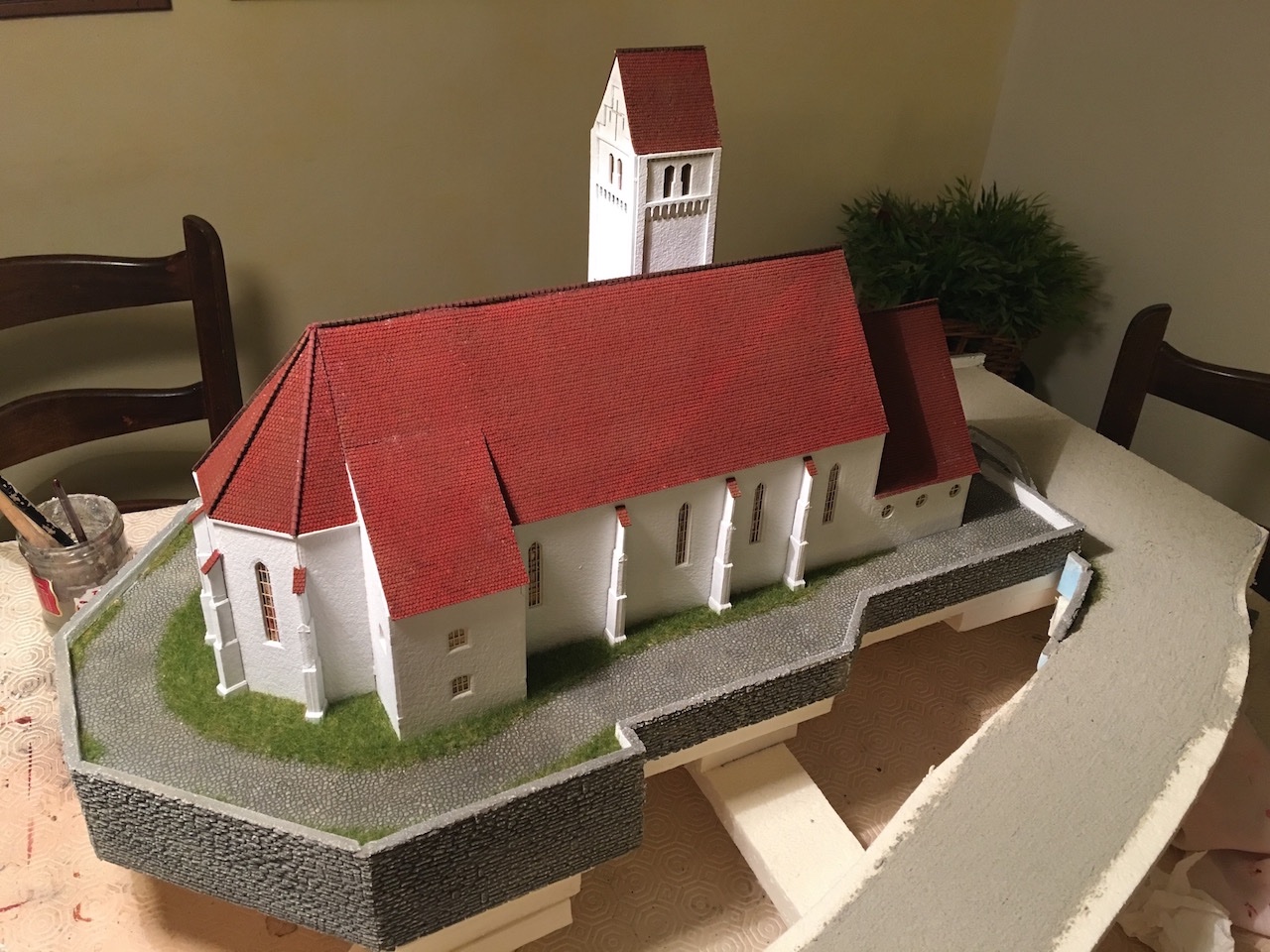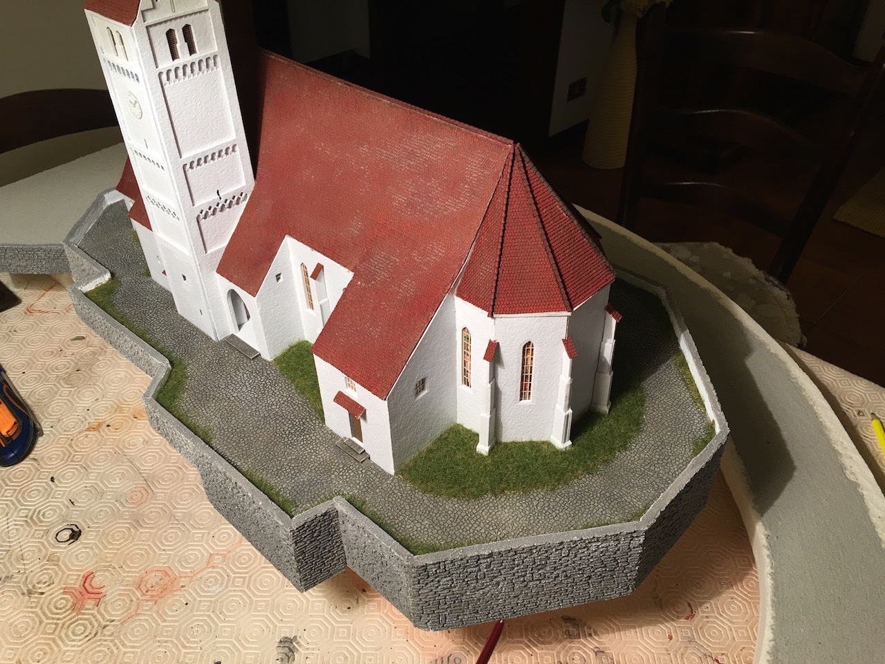 Ho iniziato a dare una forma al paesaggio sul lato sinistro con l'inserimento di una chiesa in posizione leggermente rialzata rispetto alla strada che porta alla cittadina nella parte centrale del plastico.