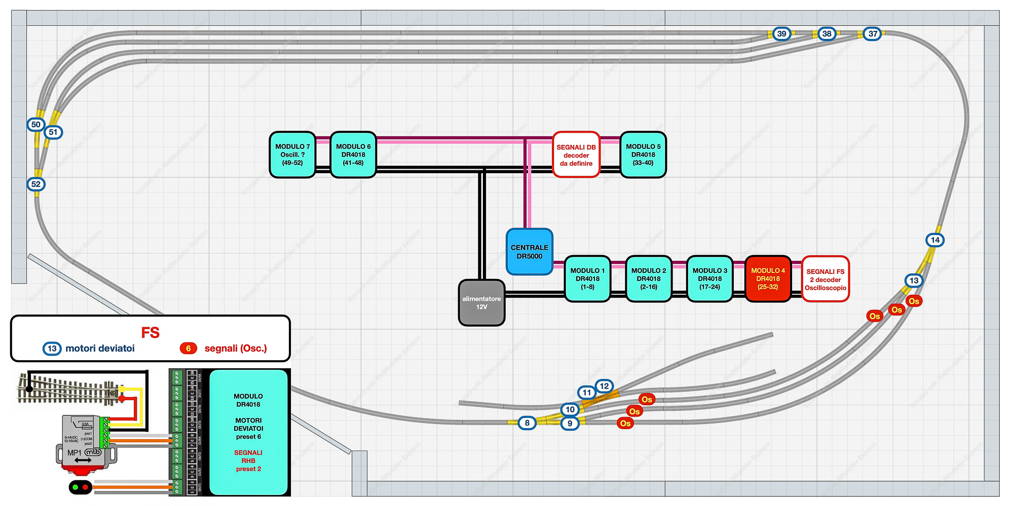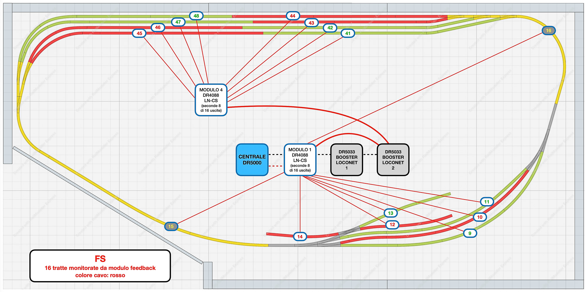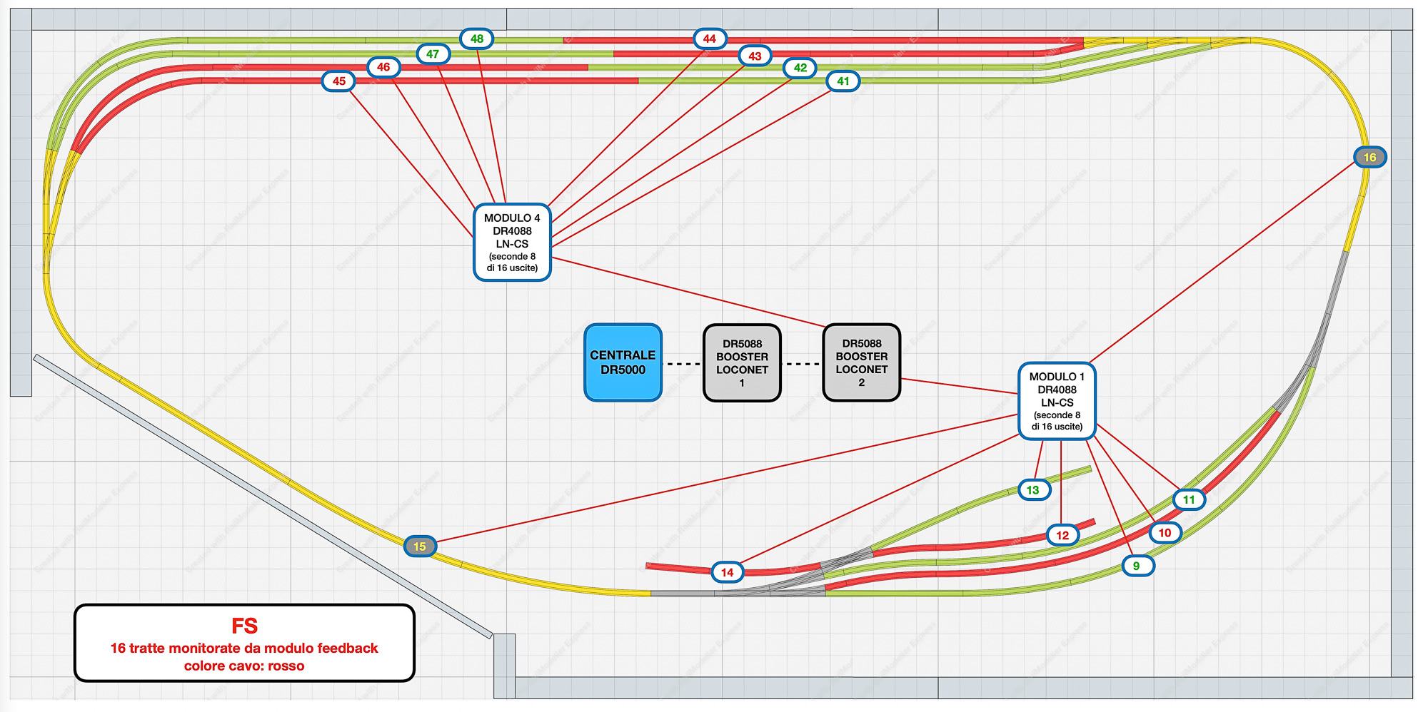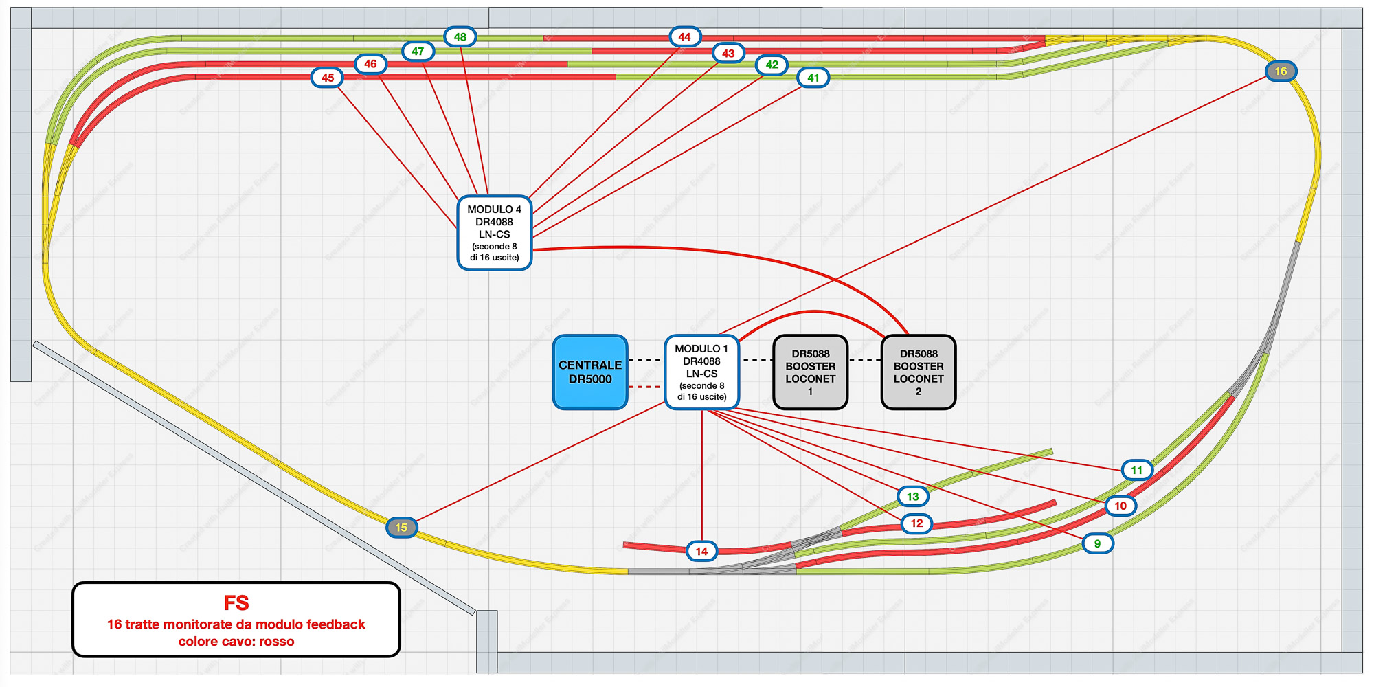 Per le retroazioni infine ho optato per una rete Loconet con mix di moduli Digikeijs (16 sezioni) e Oscilloscopio (8 sezioni) in modo da posizionare i moduli il più vicino possibile ai tratti da monitorare. Ho deciso di rinunciare al RailCom, lasciando il compito di individuare i rotabili al software di controllo.