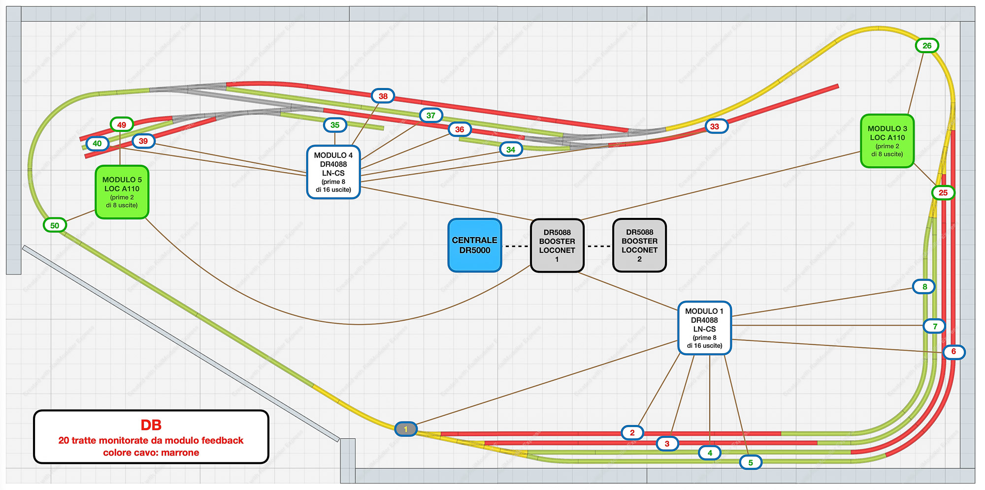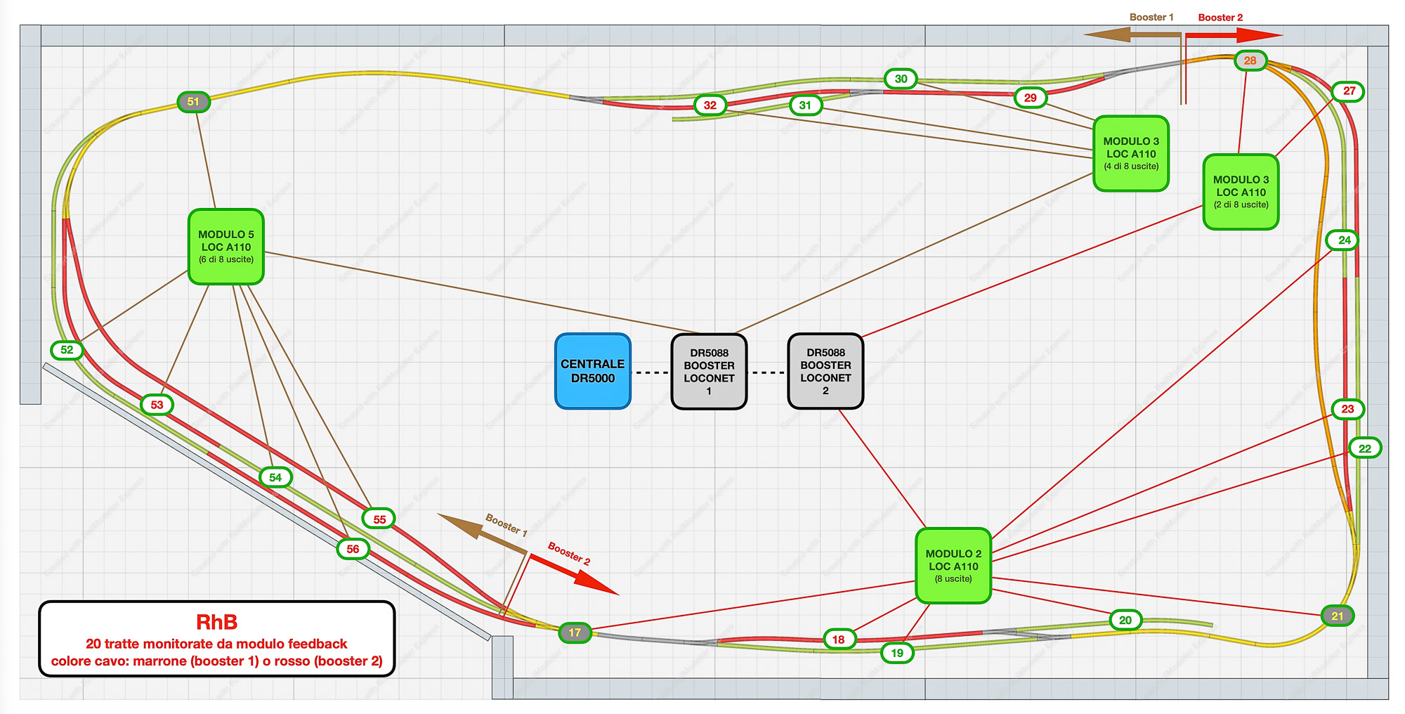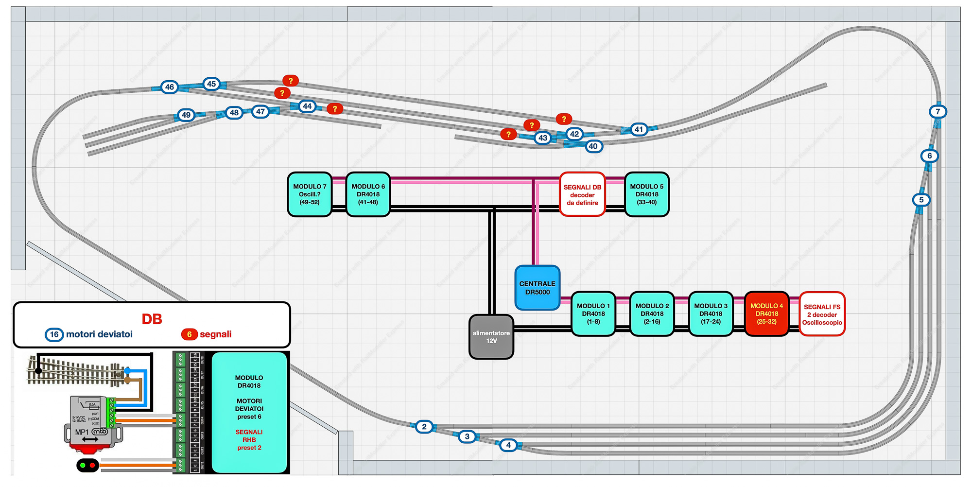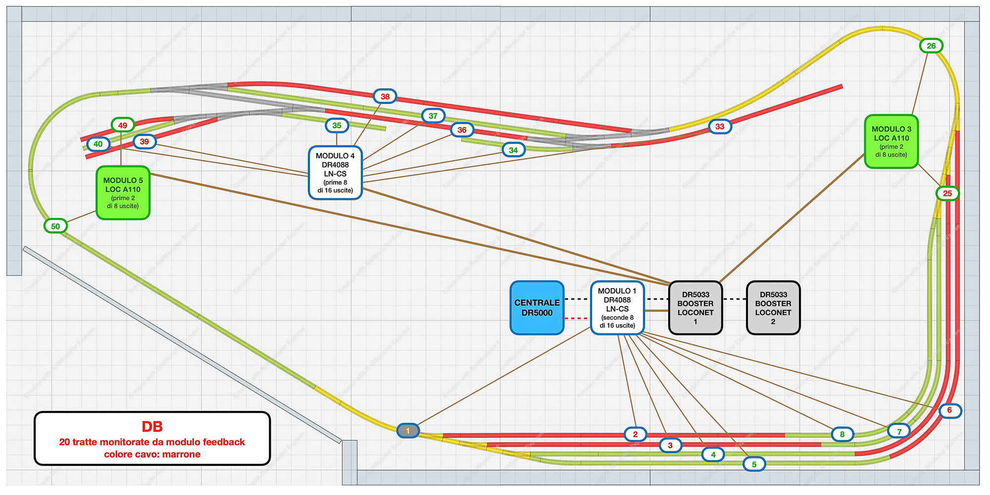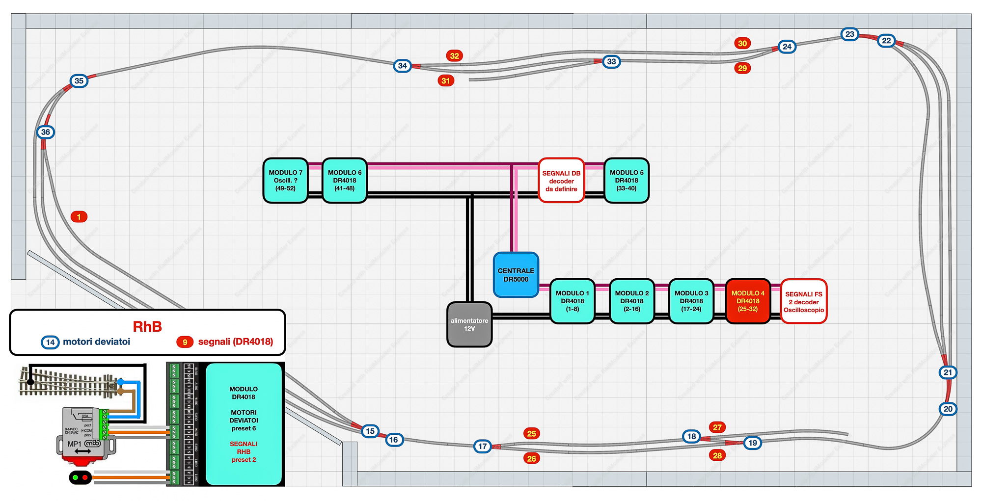 Per le retroazioni infine ho optato per una rete Loconet con mix di moduli Digikeijs (16 sezioni) e Oscilloscopio (8 sezioni) in modo da posizionare i moduli il più vicino possibile ai tratti da monitorare. Ho deciso di rinunciare al RailCom, lasciando il compito di individuare i rotabili al software di controllo.