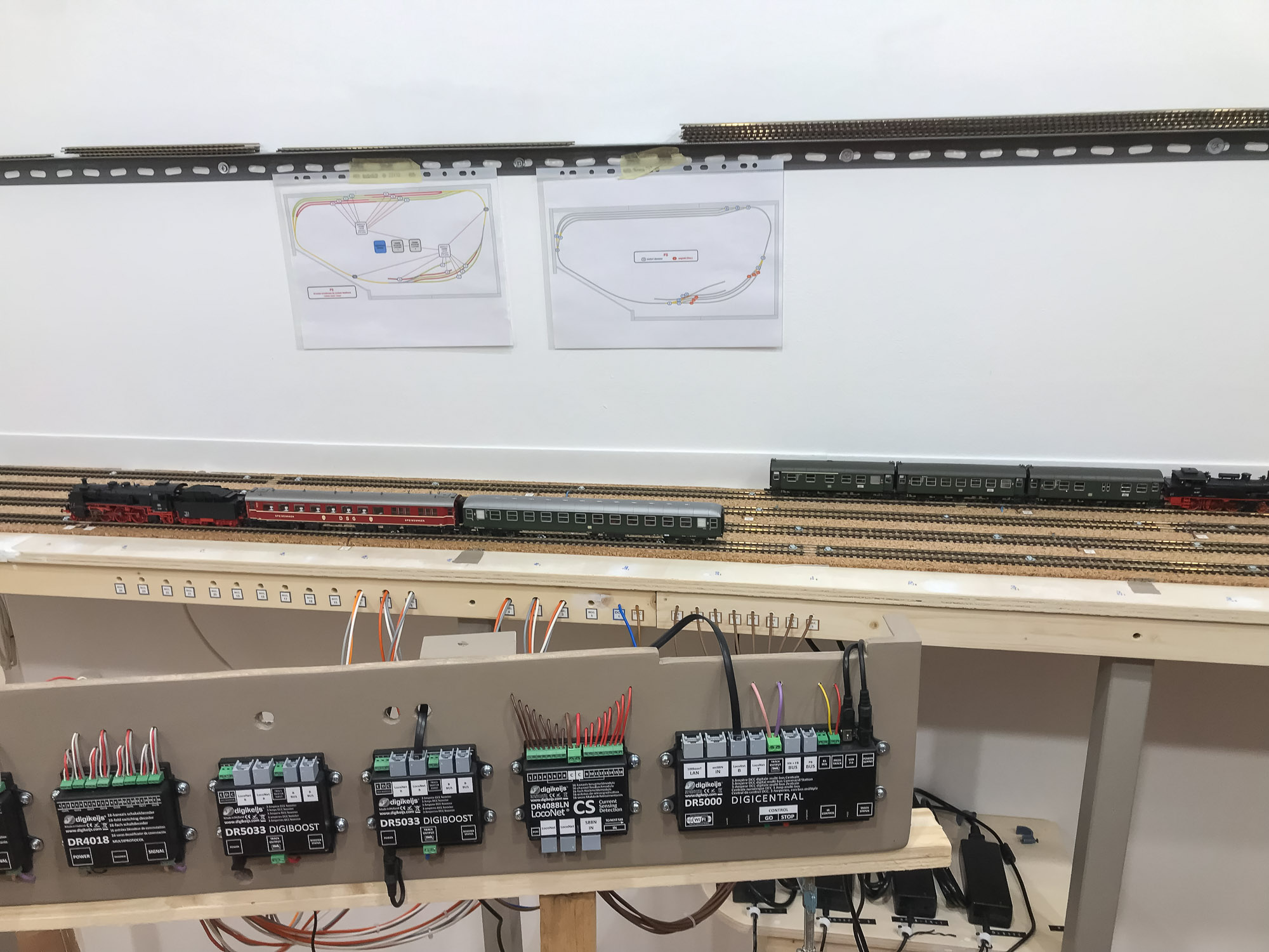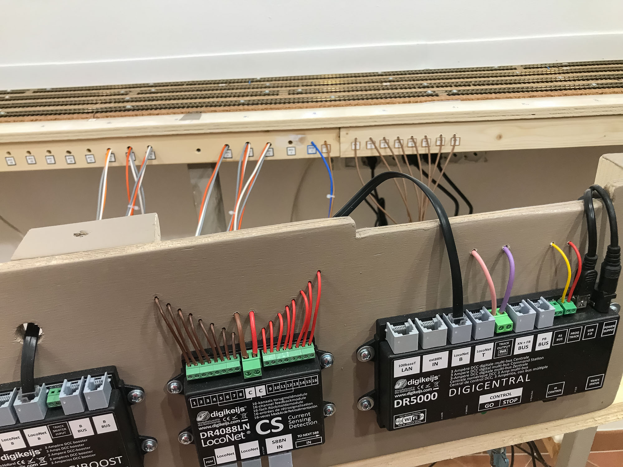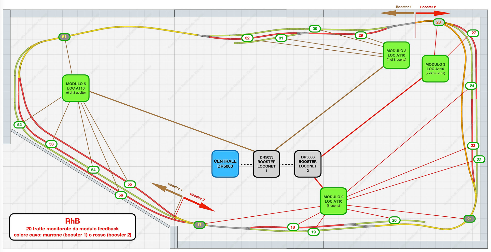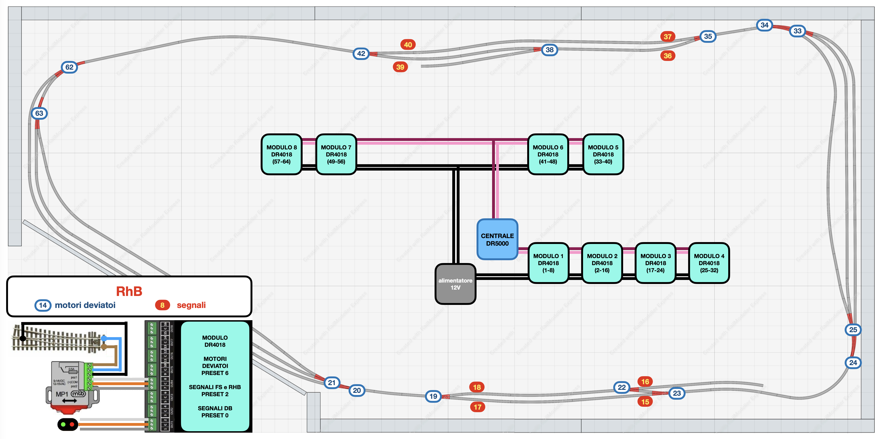Per le retroazioni infine ho optato per una rete Loconet con mix di moduli Digikeijs (16 sezioni) e Oscilloscopio (8 sezioni) in modo da posizionare i moduli il più vicino possibile ai tratti da monitorare. Ho deciso di rinunciare al RailCom, lasciando il compito di individuare i rotabili al software di controllo.