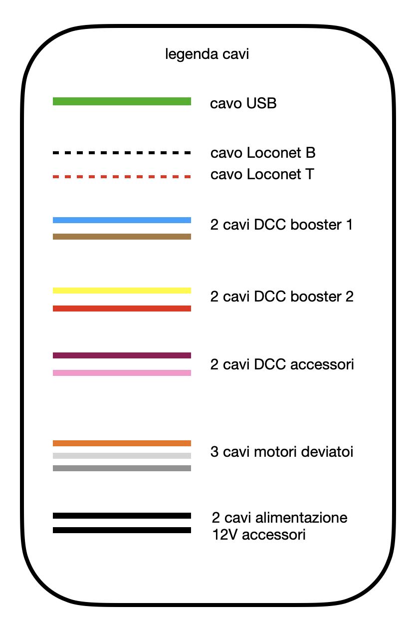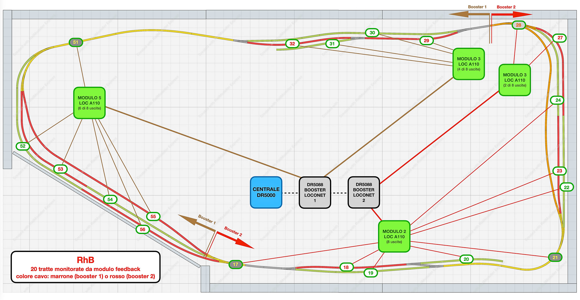 I treni verranno alimentati esclusivamente dai due boosters mentre la centrale comanderà tutti gli accessori (deviatoi e segnali). In questo modo in caso di cortocircuito andrà in protezione uno dei boosters ma la centrale dovrebbe rimanere sempre operativa consentendomi di poter continuare a manovrare i deviatoi.
