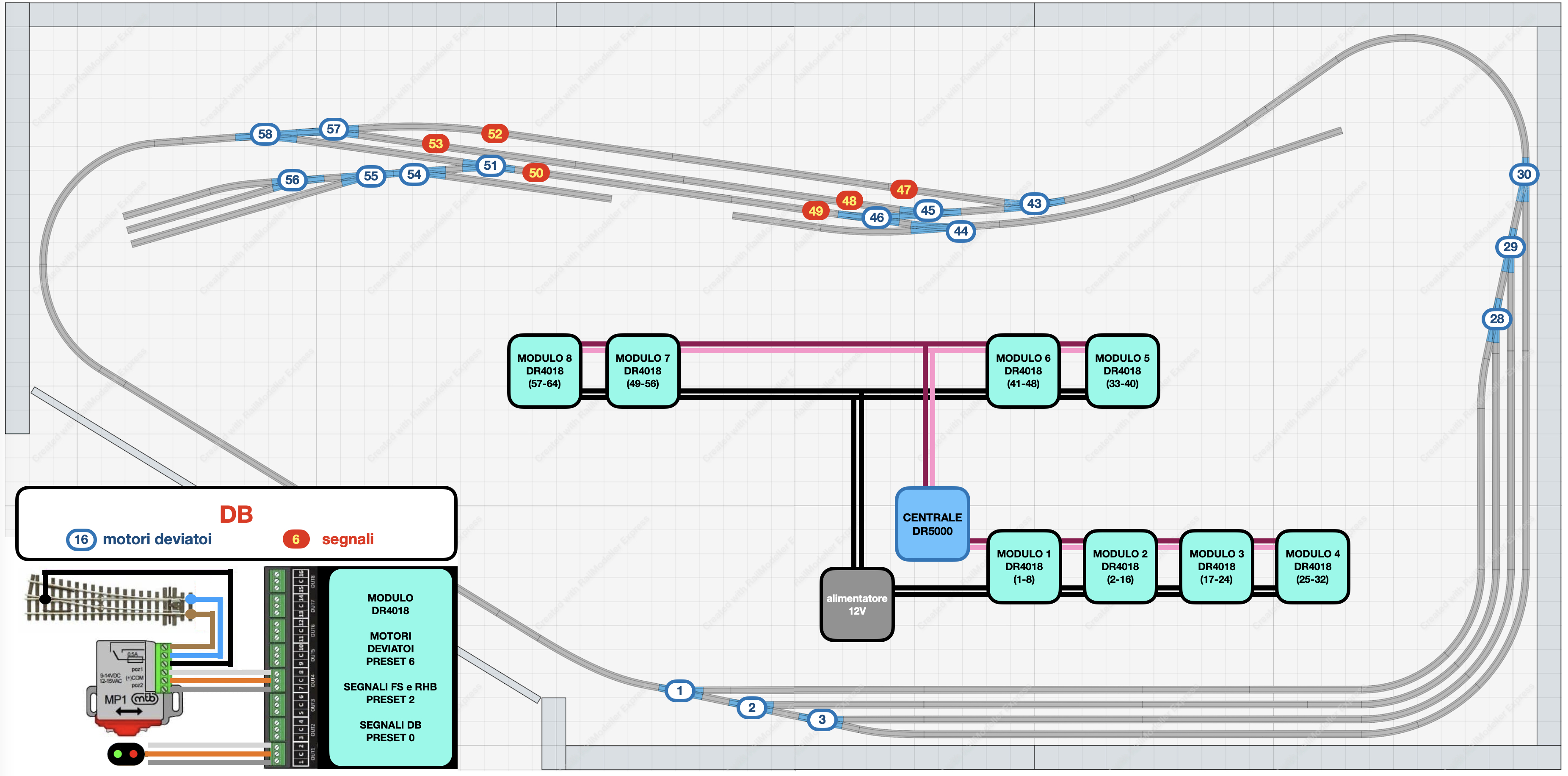 Per quelli DB (ad ala data l’epoca di ambientazione) a suo tempo analizzerò le alternative disponibili. Sul mercato esistono segnali motorizzati ad ala che incorporano il decoder ma hanno un costo notevole. Comunque c’è tempo…