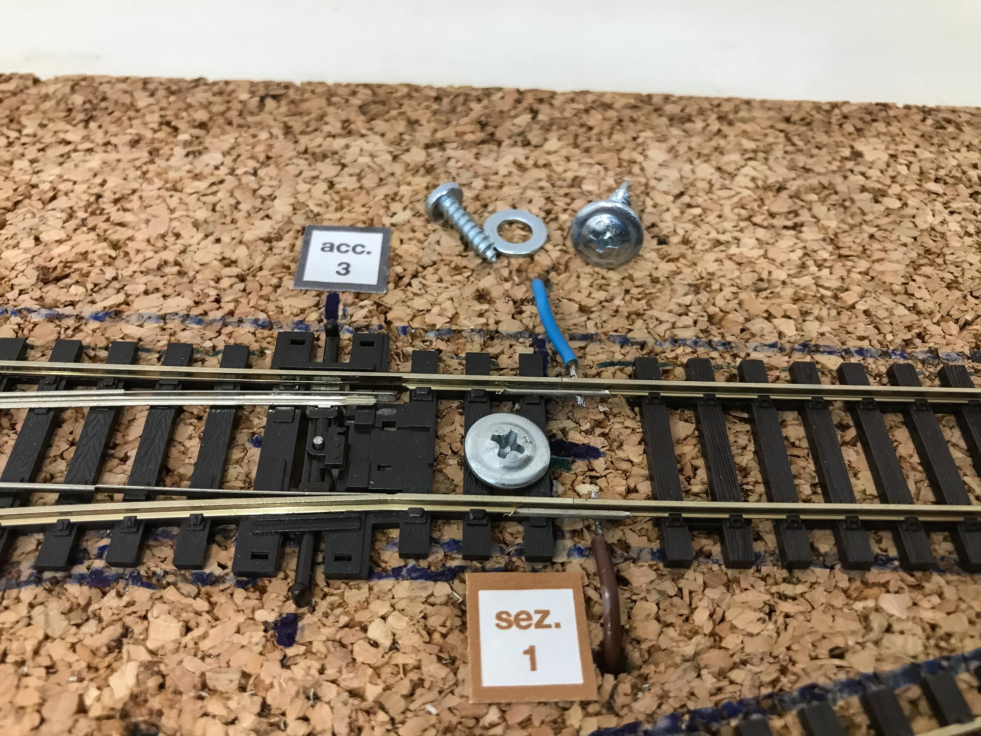 I deviatoi Peco vanno privati della piccola molla che tiene fermi gli aghi, va eliminato il ponticello presente di serie che collega il cuore con gli aghi e fatta una saldatura tra parte fissa dell'ago e binario adiacente.