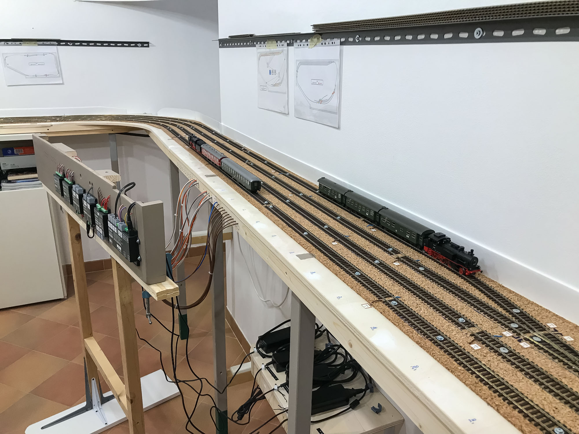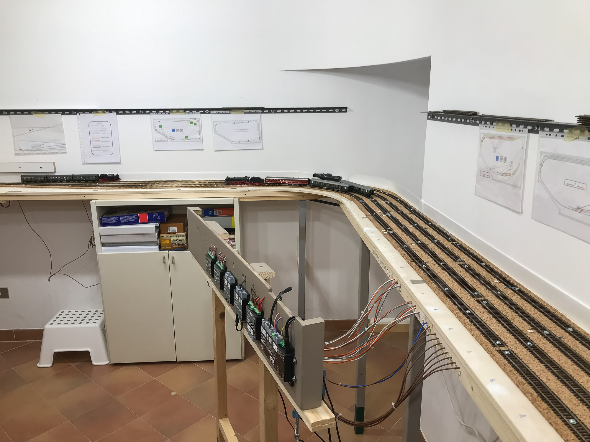 I sezionamenti sono per ora impostati ipotizzando di adottare TrainController: un solo sensore per ogni blocco. Le sezioni della stazione nascosta DB sono 8, ciascuna lunga poco più di due metri e composta da 3 pezzi di binario flessibile. Tutti gli spezzoni di binario sono stati elettrificati in modo da potere, se necessario, aggiungere altri sensori qualora, invece di TrainController, alla fine adottassi altri tipi di software che li necessitano.