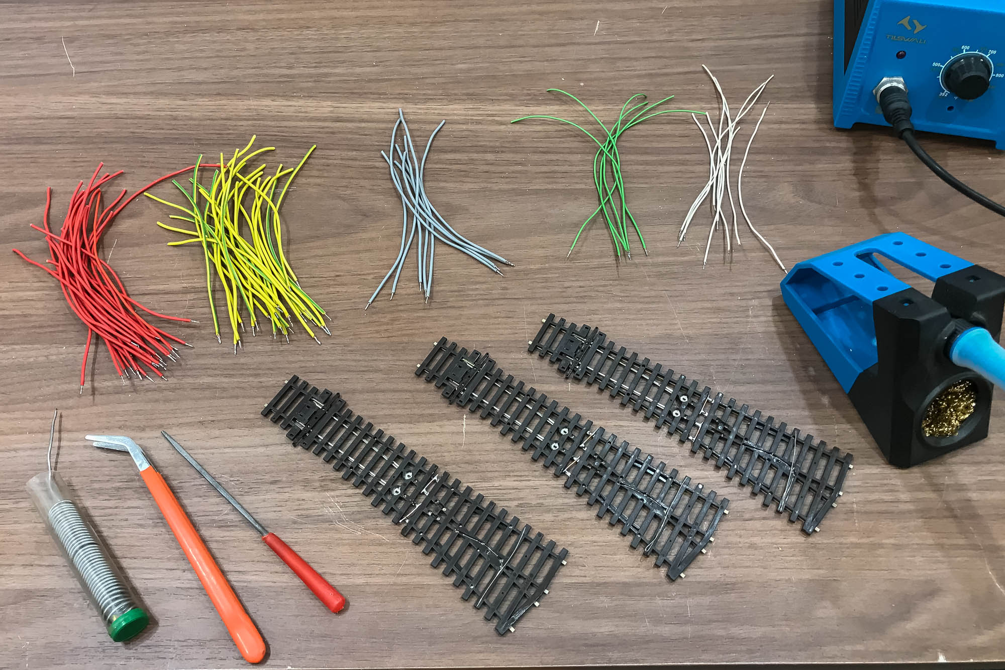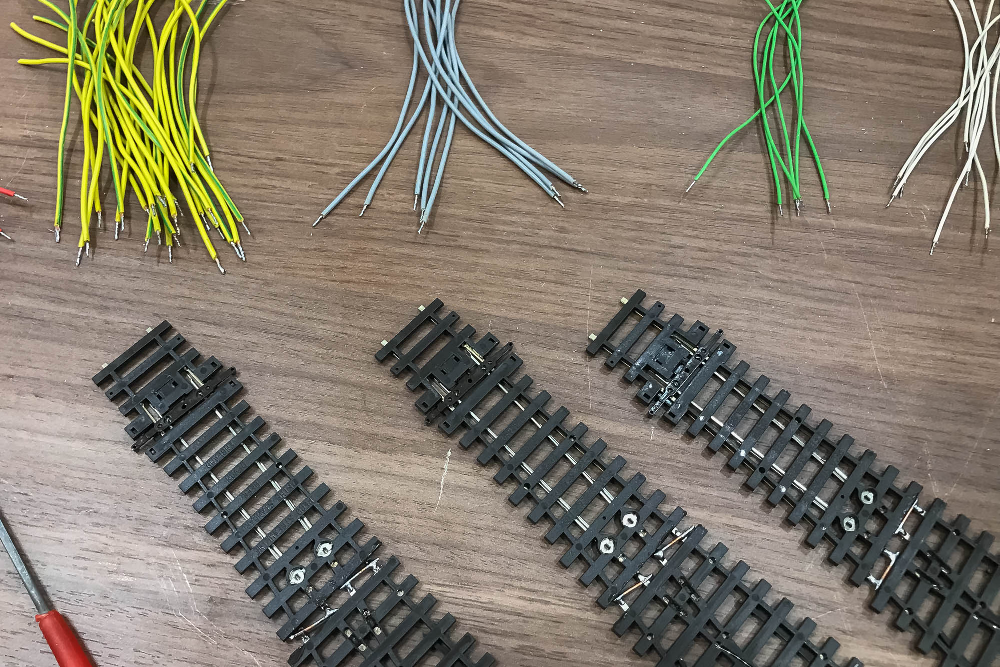 In vista della posa dei binari ho predisposto tutti gli spezzoni di cavo elettrico che mi serviranno (sei deviatoi e dieci sezioni da collegare ai moduli di retroazione) e, infine, preparato i tre deviatoi della radice destra.